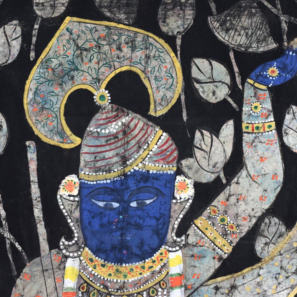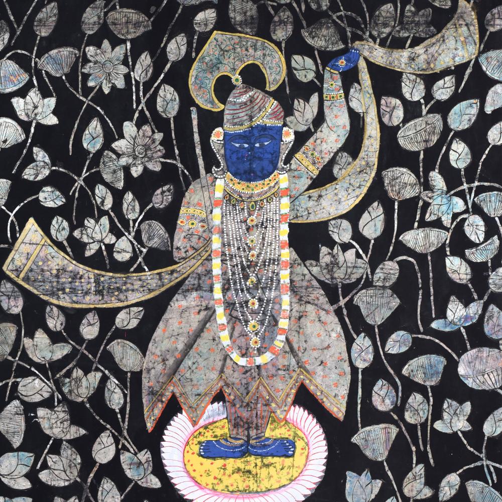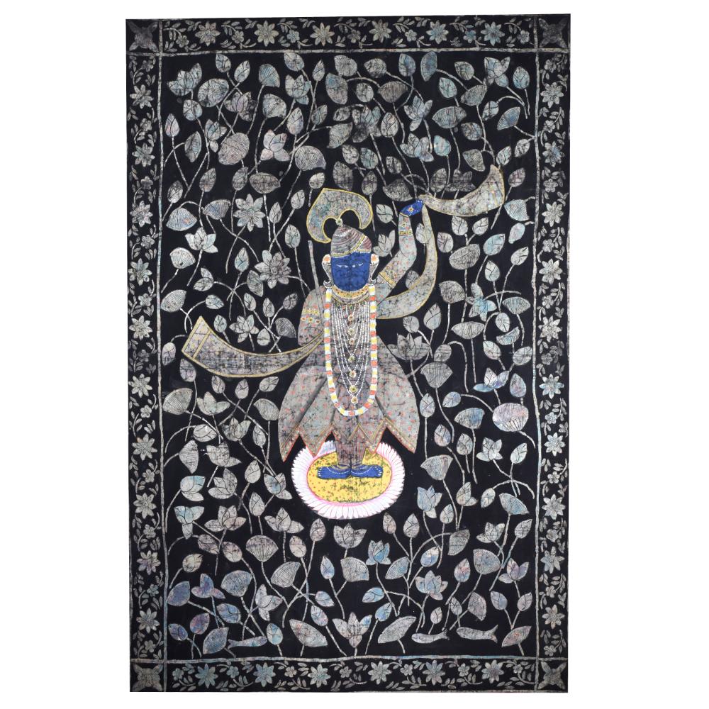 Elevate your living space with the mesmerizing beauty of this cloth pichwai painting featuring the beloved Lord Krishna without frame. Crafted with meticulous attention to detail, this stunning work of art showcases the timeless grace and charm of the blue-hued deity, transporting you to the serene landscapes of ancient India. This pichwai painting is more than just a decorative piece; it's a captivating window into the rich cultural heritage of India. As you gaze upon Lord Krishna's serene expression and elegant pose, you'll be drawn into a world of spirituality and wonder. It's a work of art that has the power to inspire reflection, contemplation, and a deeper connection with the divine. Whether you're a devoted Krishna devotee or simply appreciate the beauty of Indian art, this pichwai painting will elevate the ambiance of any space. Hang it in your home, office, or place of worship, and let its captivating presence transport you to a realm of timeless beauty and spiritual significance. Immerse yourself in the divine splendor of this exceptional work of art and let it become a cherished part of your spiritual journey.