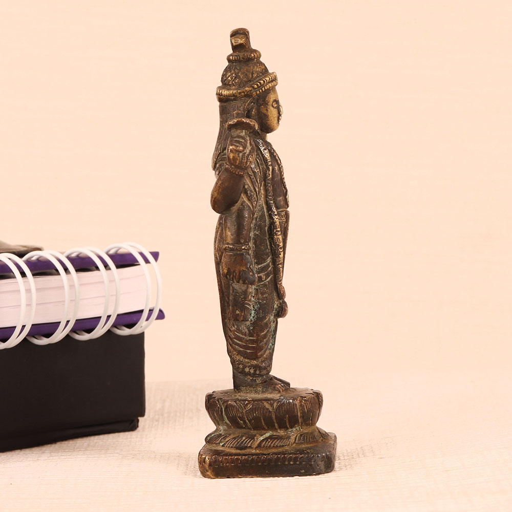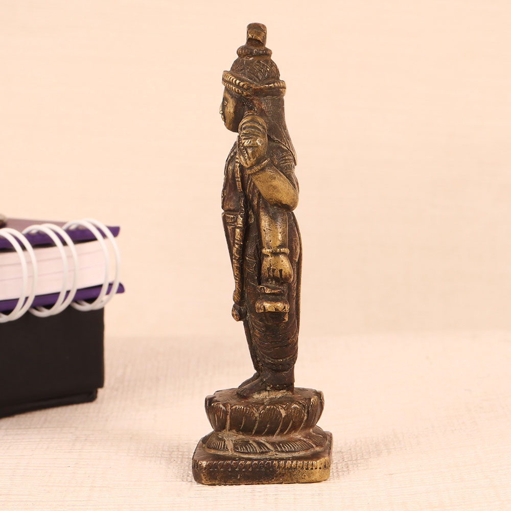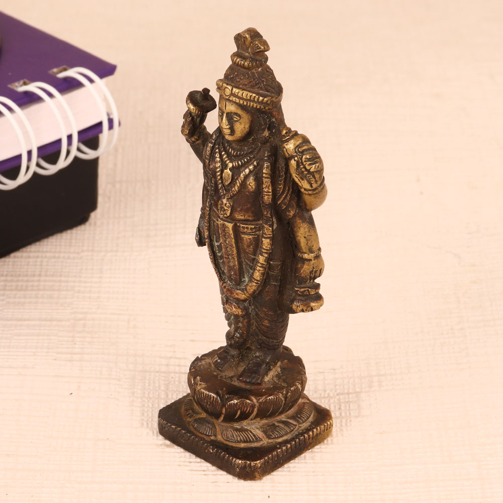 Buy a brass statue of Lord Vishnu online and get a hassle free delivery to your doorstep. Crafted by highly skilled Indian artisans with a profound reverence for tradition, this remarkable piece stands as a testament to the rich cultural heritage of India. Standing atop a meticulously detailed platform, the statue is finished in an antique brown hue adding a sense of antiquity and authenticity to its design. Lord Vishnu, one of the principal deities in Hinduism, is depicted in all His divine glory, exuding a sense of serenity and power. This splendid creation is not just an art piece but a spiritual symbol that can be cherished in various settings. Place it in your home, office, restaurant, hotel, cafe, or shop prayer room to infuse the surroundings with an aura of spiritual significance and aesthetic beauty. It also makes for an ideal addition to any vintage collection, appealing to collectors with an appreciation for artistry and culture. Furthermore, this statue serves as a thoughtful and meaningful gift for your family, friends or relatives on special, festive, or auspicious occasions, conveying your best wishes and blessings through a symbol of divine presence. Embrace the essence of Lord Vishnu's grace with this handcrafted masterpiece, a true embodiment of artistry, spirituality, and tradition.