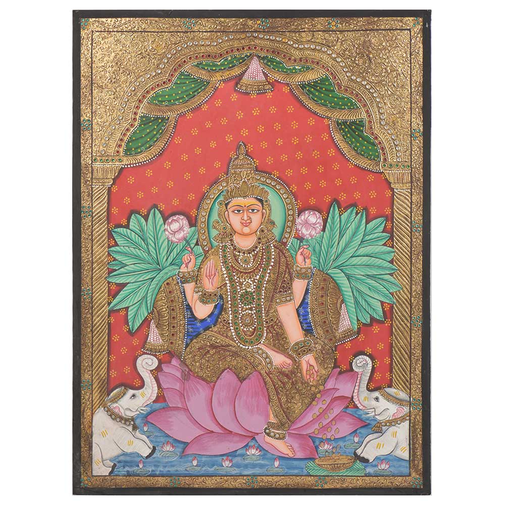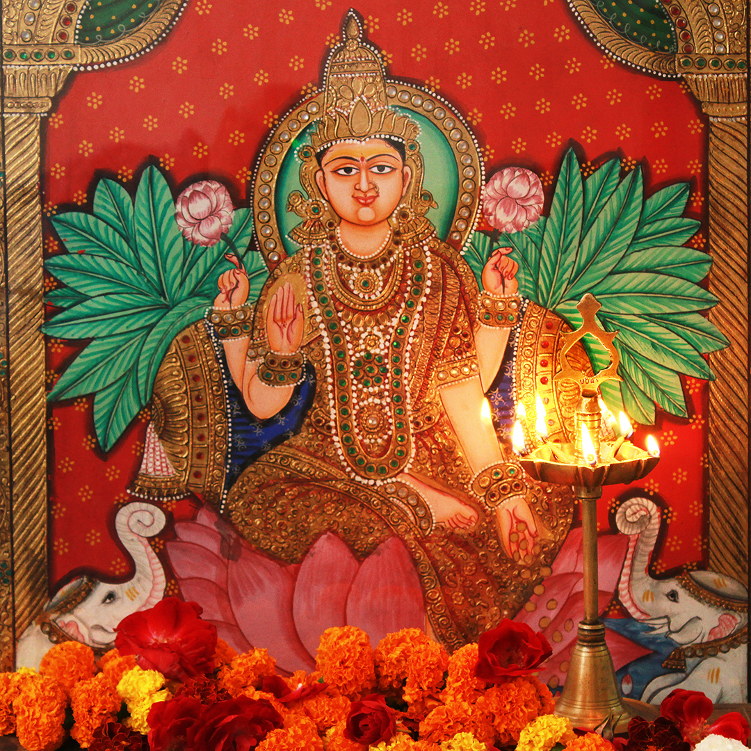 Lakshmi is depicted as a beautiful woman of golden complexion, with four hands, sitting or standing on a full-bloomed lotus and holding a lotus bud, which stands for beauty, purity and fertility. Her four hands represent the four ends of human life:dharma or righteousness, "kama" or desires, "artha" or wealth, and "moksha" or liberation from the cycle of birth and death.