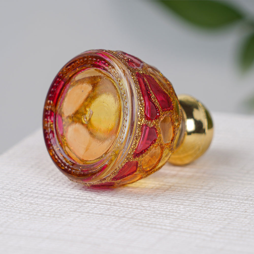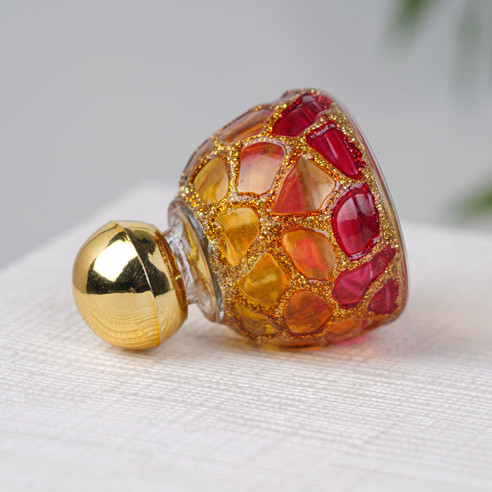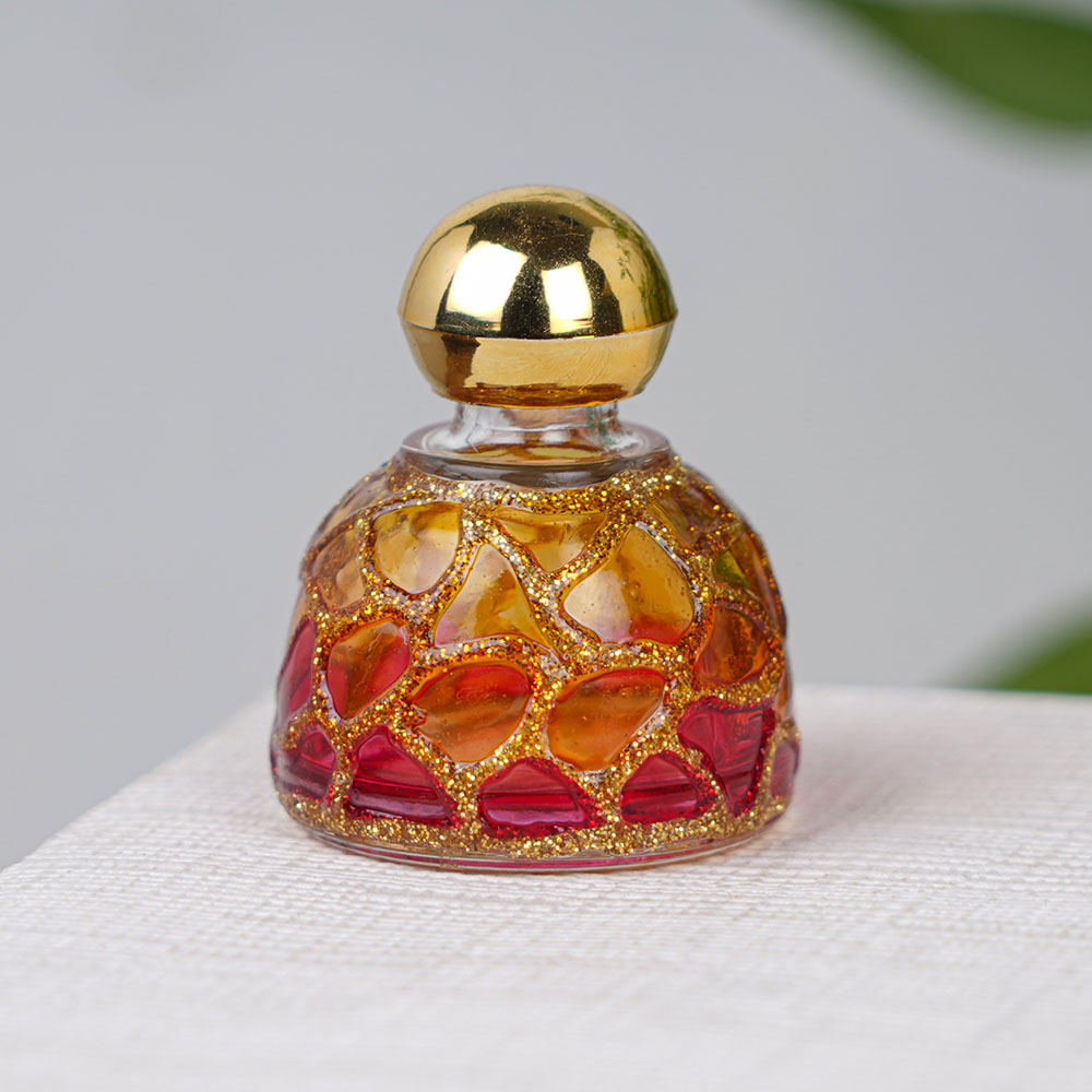 A glass bottle which is a true work of art, handmade by skilled Indian craftsmen with precision and care. The vibrant orange and magenta hues blend beautifully together, creating a striking and eye-catching design that is sure to capture attention. The sparkling texture carved into the glass adds a touch of glamour and elegance to the overall appearance of the bottle. Featuring a golden coloured knob that is used to close the bottle, this unique piece can be placed on a table or shelf as a beautiful decoration. The intricate design on the bottle makes it a perfect addition to any collection, whether it is a collection of perfume bottles, small perfume bottles, or perfume tester bottles. The bottle can be used to store perfume or oil, and its stunning design makes it a lovely gift for family, friends or relatives on special or festive occasions. Whether used as a decorative item or for storing fragrance, this bottle is a true testament to the skill and artistry of the craftsmen who created it.