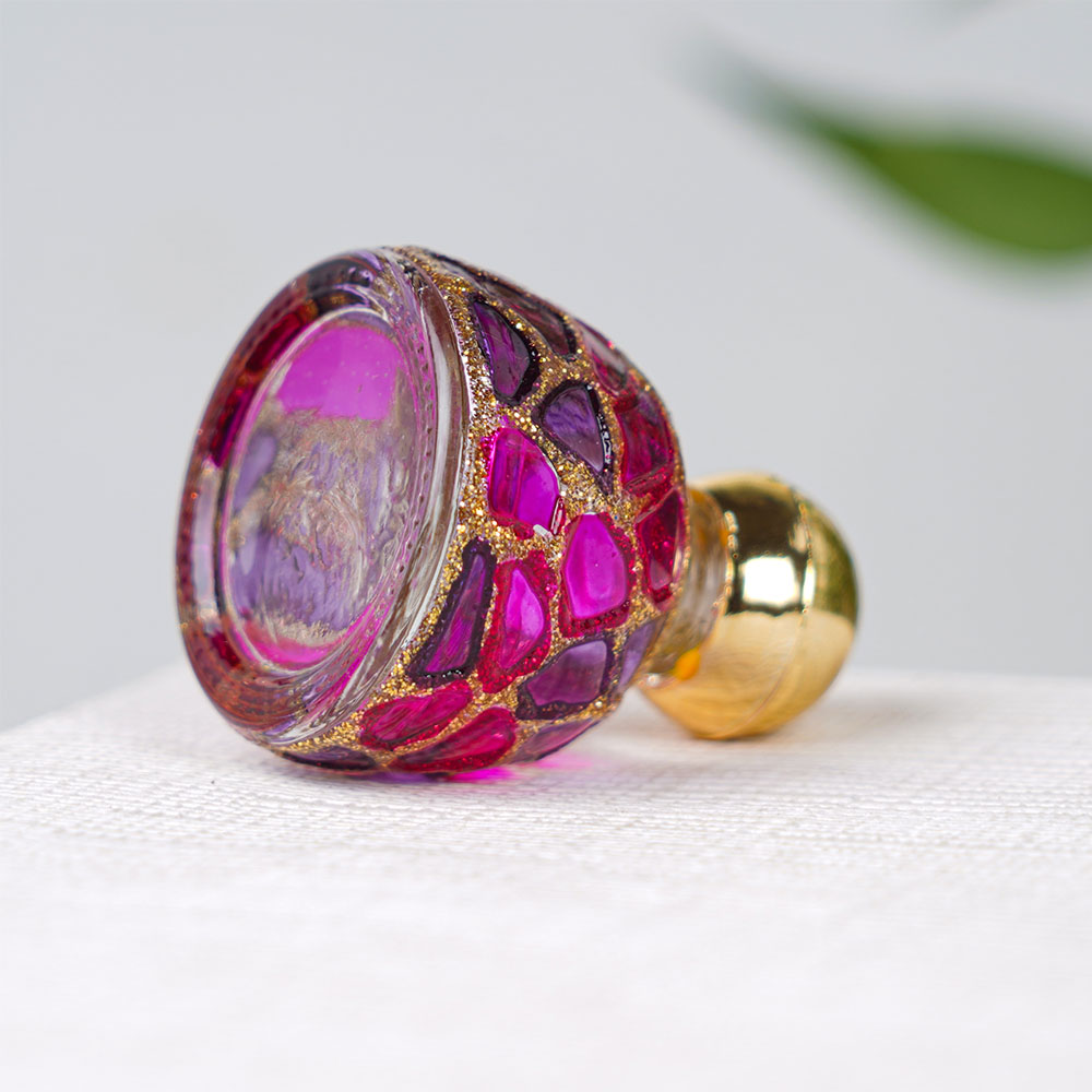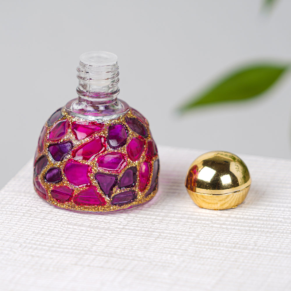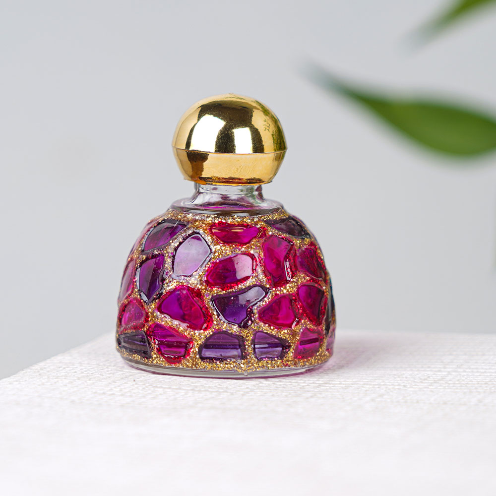 This glass bottle is a beautiful work of art handmade by skilled Indian craftsmen. The combination of purple and pink colours with golden sparkles carved in its glass makes it a unique and eye-catching piece. The golden colour knob used to close the bottle adds a touch of elegance and sophistication. This custom perfume bottle is not only a functional item for storing your favourite fragrance or oil, but also a beautiful decorative piece that can be placed on a table or shelf to add a pop of colour to any room. Its intricate design carved on the glass creates a mesmerizing effect when the light reflects off the golden sparkles. This cute perfume bottle is also a perfect gift for your family, friends, or relatives for special or festive occasions. The engraved perfume bottle adds a personal touch and shows that you put thought and effort into choosing a meaningful gift.