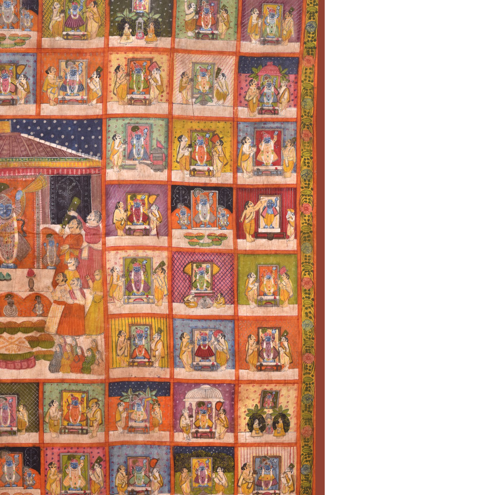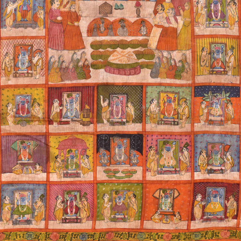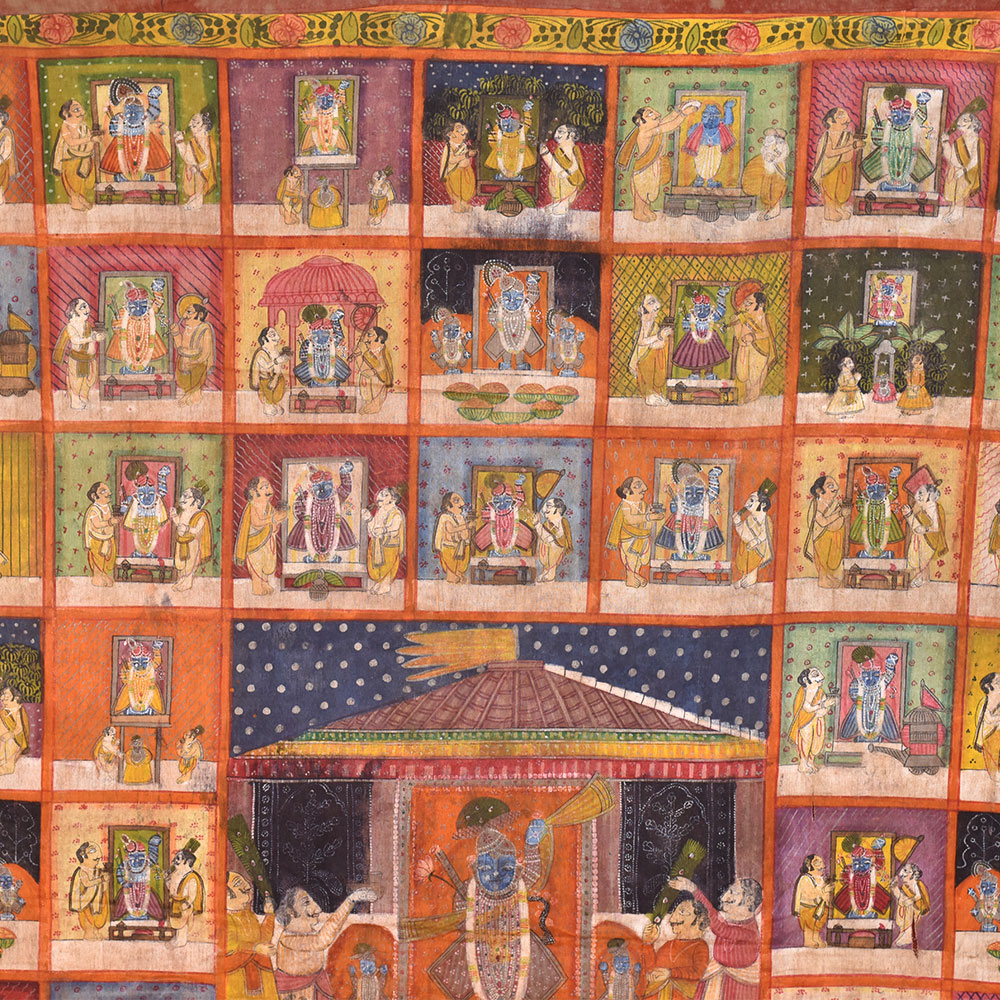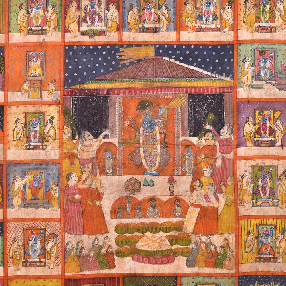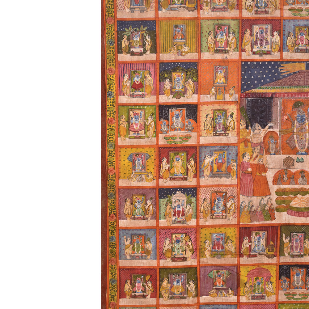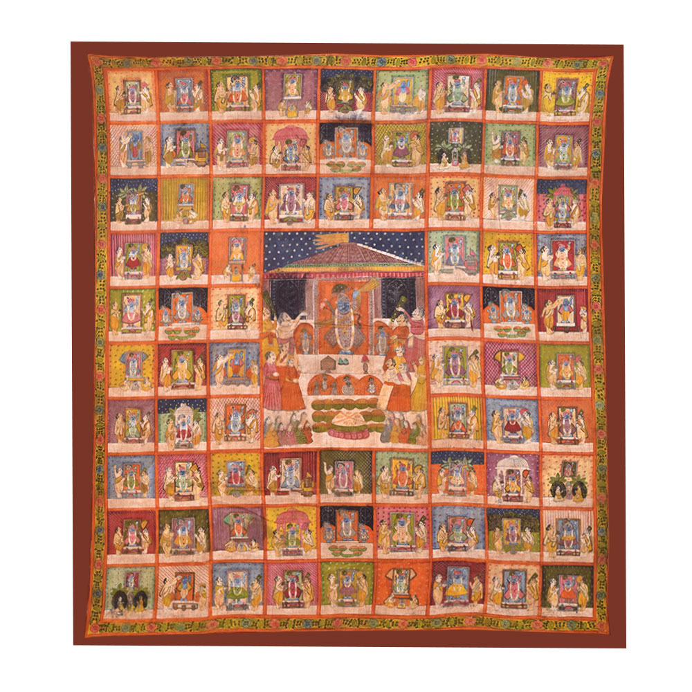 A pichwai painting is a beautiful and intricate form of Indian art that has been around for centuries. This particular pichwai painting on fabric cloth depicts a stunning scenery of a Hindu Temple at the centre of the painting, surrounded by 78 different scenes of Hindu god temples. Each scene features two devotees, adding to the overall sense of devotion and worship that the painting conveys. The painting is expertly crafted by professional Indian artists who have used multiple colours to create a rich and vibrant image that is sure to catch the eye. The level of detail and the intricacy of the design make this painting truly special and unique. This pichwai painting would be a perfect addition to any prayer room or temple, providing a sense of calm and serenity to the space. It would also make a wonderful gift for family, friends, or relatives on special or festive occasions such as weddings, Diwali, or other religious festivals. Overall, this pichwai painting is a beautiful representation of Hindu art and culture and is sure to be treasured by anyone who receives it.