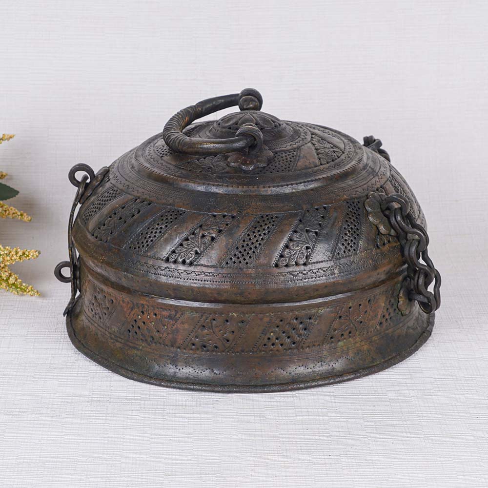 This handcrafted brass round jewelry box is a stunning piece of art created by skilled Indian craftsmen using traditional techniques. Made from high-quality brass, it features a rich dark brown finish that exudes elegance. Originally used to store precious items and jewelry, this versatile box is now a perfect storage solution for your jewelry or precious stones. The jewelry box showcases exquisite engravings, adding a touch of beauty and sophistication. It is equipped with a secure latch for locking and a convenient handle on the top, allowing you to carry it with ease. This versatile box is not only functional but also makes for a captivating decorative piece that can enhance the ambiance of your home, office, restaurant, or hotel. With its impeccable craftsmanship, this jewelry box can be proudly displayed at exhibitions or museums. It also makes a thoughtful and luxurious gift for your family, friends, or relatives on special occasions or festive celebrations. Whether you're looking for a jewelry box, a girl's jewelry box, or a luxury jewelry box, this brass round jewelry box is sure to delight with its timeless beauty and craftsmanship.