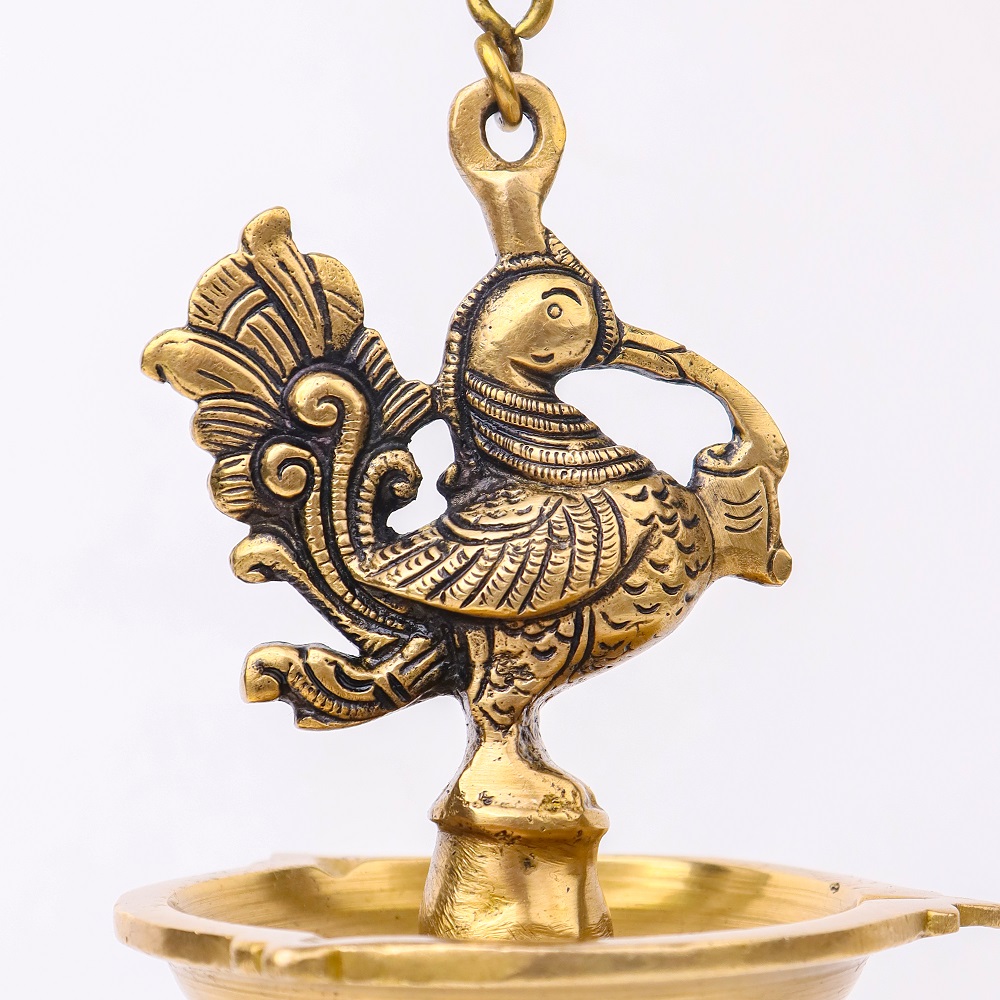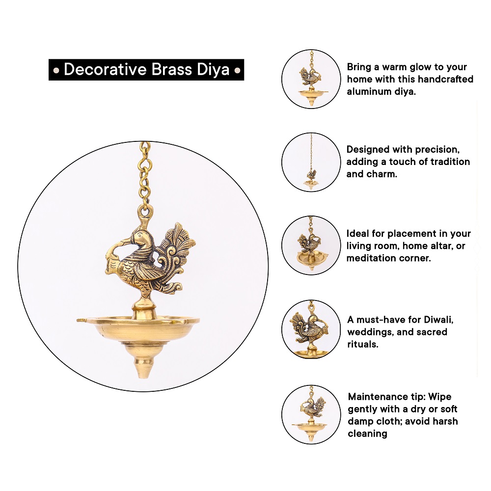 Decorate Your Homes, Offices, Temples with this magnificent brass peacock with hanging lamp Or diya with a lovely chain with a hook. Part of any religious or cultural gathering. Gift for your near and dear ones.