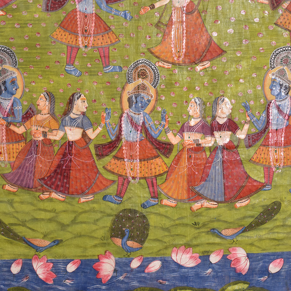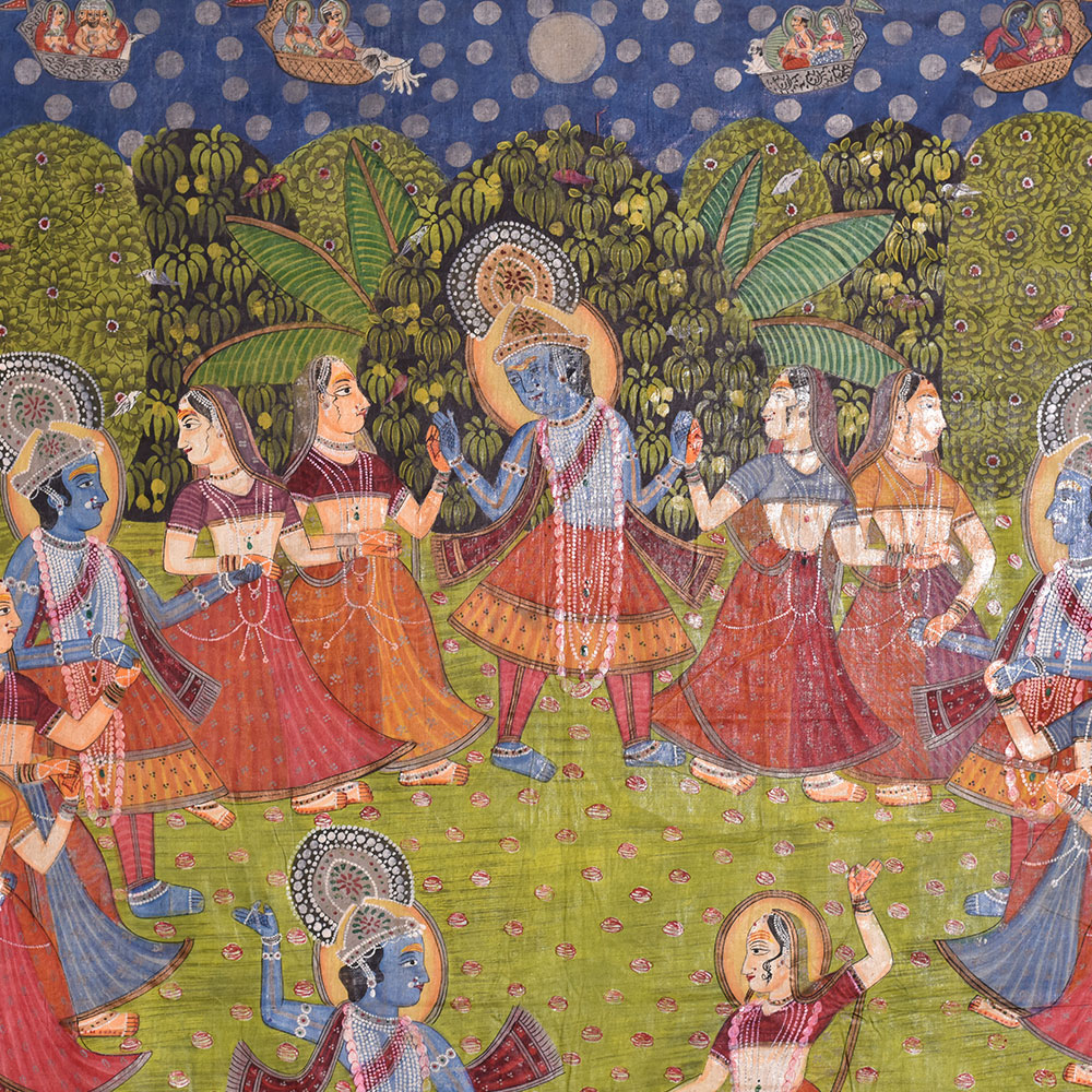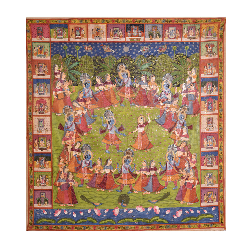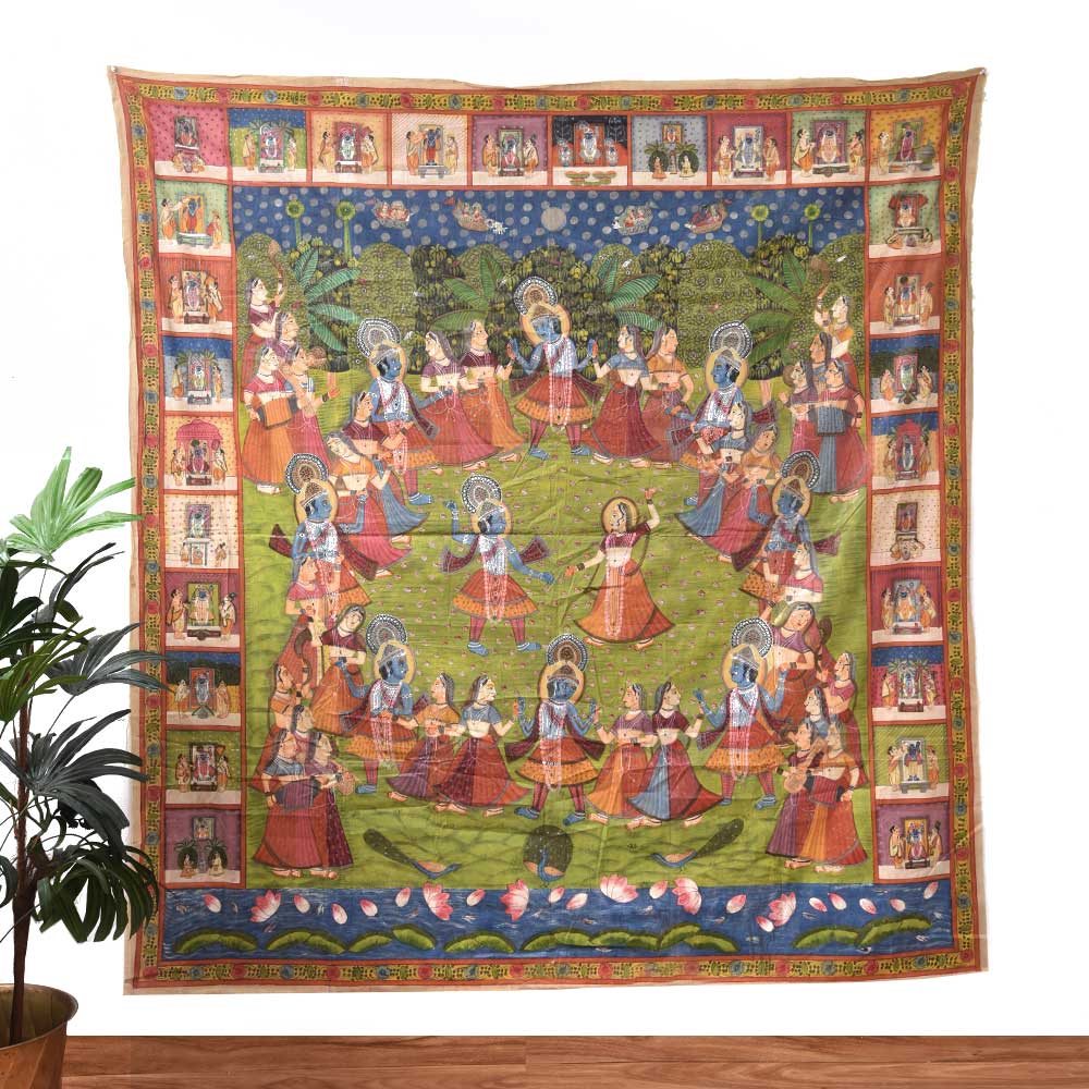 Maha Raas is a word used in Hindu mythology to describe Lord Krishna's holy dance with the cowherd females of Vrindavan. This cosmic dance is regarded as one of the most critical episodes in Lord Krishna's life, and it has been represented in numerous art genres, including Pichwai paintings. The Maha Raas Pichwai artwork is a stunning depiction of this exquisite dance and a monument to India's rich cultural legacy. Lord Krishna is seen in his trademark blue skin, surrounded by gopis in various attitudes, dancing and chanting in pleasure. The painting's composition is centred on Lord Krishna, who is seen playing his flute and surrounded by gopis. The gopis are seen in bright saris dancing around Lord Krishna, engrossed at the moment. The artwork's backdrop is loaded with detailed features, such as trees, flowers, and animals, which give the image depth and substance. The painting's bold and brilliant colours, red, yellow, and green, dominate the composition. The artwork reflects the joyous mood of the Maha Raas, with Lord Krishna and the gopis lost in divine pleasure throughout the dance. The Maha Raas Pichwai painting or artwork is a monument to the painters' ability and ingenuity and a celebration of Hindu mythology's profound spiritual origins. It is a work of art that has inspired and delighted people of all ages and backgrounds for centuries. The picture is a magnificent depiction of Lord Krishna's holy dance and a doorway into India's rich cultural past, where art and spirituality have been entwined for generations.