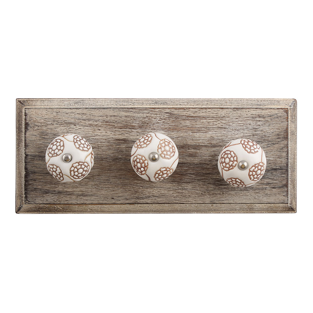 Marigold Brown Etched Ceramic Floral Wooden Hook. A Perfect Complement to the Soft Tone of the Wood are these White Traditional Hat & Coat Hook Made of Genuine Porcelain and Brass. It can be use to Hang Jewellery, Leashes, Towels, Scarves, Light Weight Sweaters, Caps Etc.