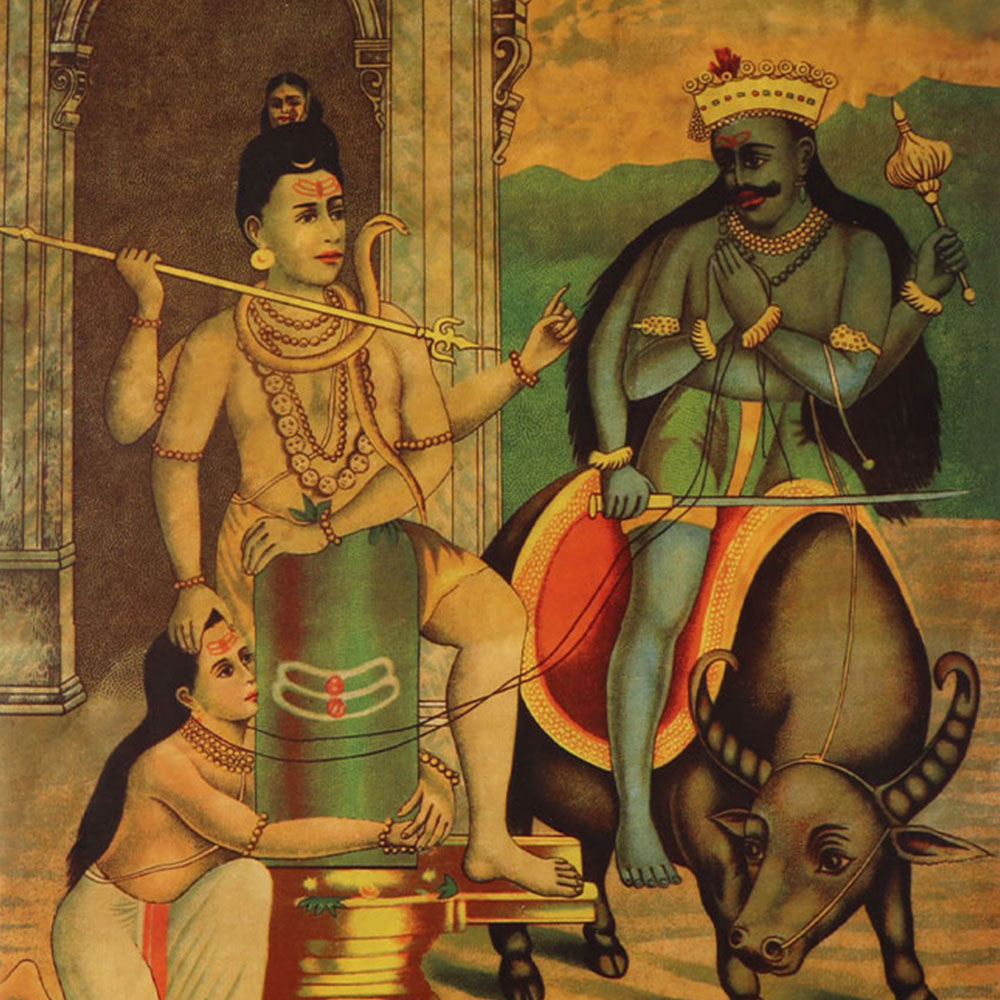 This paper print Raja Ravi Varma shows Lord Shiva saving his devoted follower Markandeya, who is scheduled to pass away on his sixteenth birthday. However, Markandeya's prayers cause the Lord to emerge from the Shiva linga and halt the death deity Yama. One of the significant immortals in Hindu mythology is Markandeya. As the years passed, the fateful day—his 16th birthday—came when Yama, the god of death, came to take the boy's life. Markandeya was pleading with Lord Shiva when Yama threw his noose, encircling both the Shiva Ling and Markandeya. An enraged Shiva emerged from the Shiva Linga, and Yama became frightened. All the gods trembled and came to appease Shiva and protect Yama.