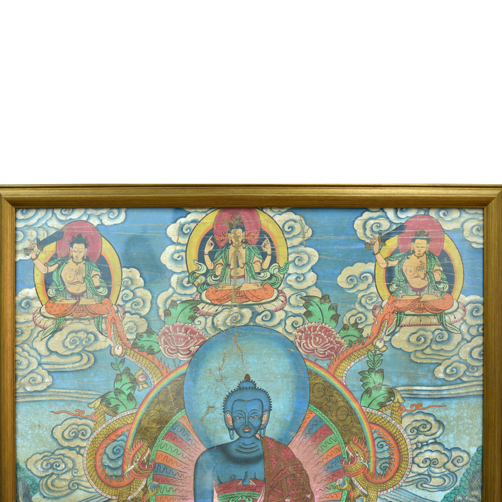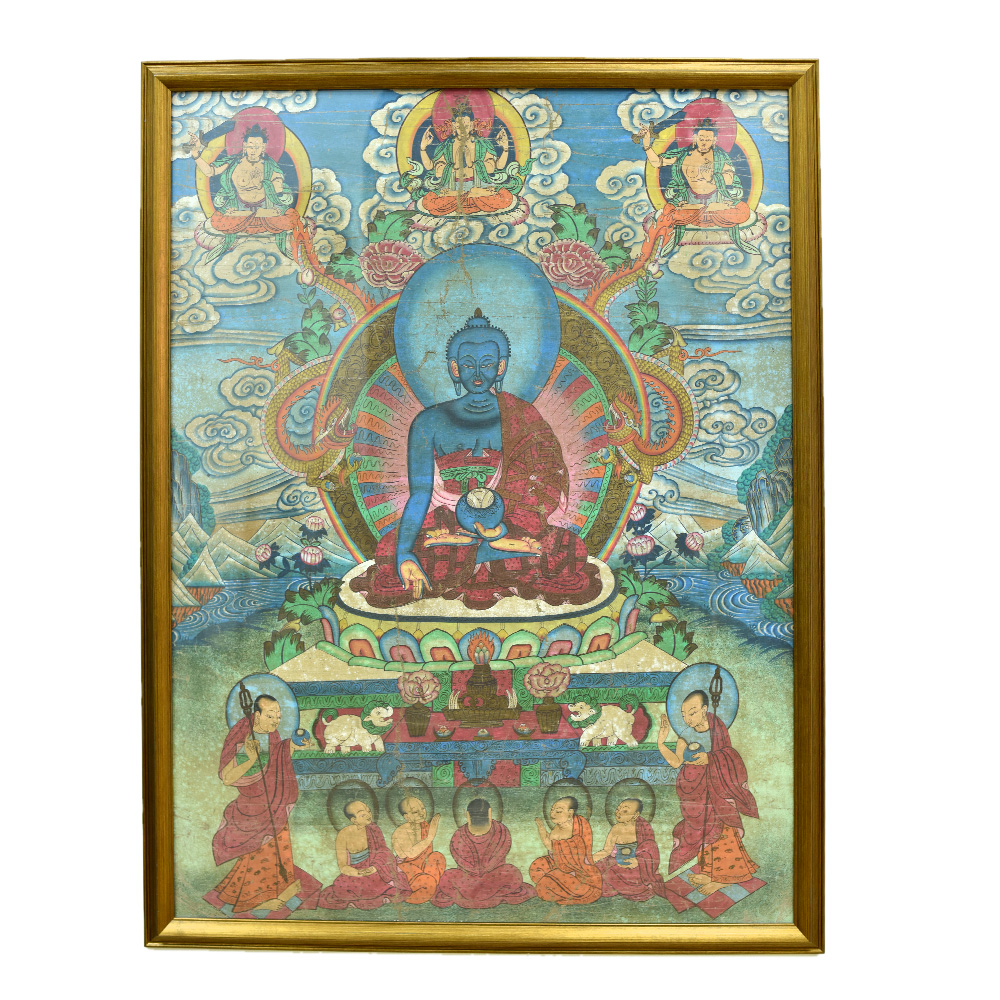 Immerse yourself in the healing aura of the Medicine Buddha Bhaisajyaguru with this cloth painting. Radiating serenity and compassion, the Medicine Buddha is a revered figure in Buddhist tradition, embodying the ultimate healing power both for physical ailments and the spiritual well-being. The painting captures the essence of Bhaisajyaguru's benevolent presence, surrounded by a halo of soothing blue light that signifies his profound healing energy. This carefully crafted cloth painting is not just a visual delight, but also a symbol of hope and restoration. With intricate details and vibrant colours, it brings a sense of tranquillity and balance to any space. Whether you choose to hang it in your home or office, this painting serves as a reminder of the potential for healing and renewal that resides within us. Adding this masterpiece to your vintage collection would be an opportunity to own a piece of spiritual and artistic heritage. Moreover, it's an excellent candidate for museum display, where its cultural and artistic significance can be appreciated by a wider audience. Consider gifting this painting to your loved ones on special, festive, or auspicious occasions, extending to them your wishes for good health and well-being. Let the Medicine Buddha's presence in this artwork inspire and uplift, making it a cherished and meaningful gift that resonates on both spiritual and aesthetic levels.