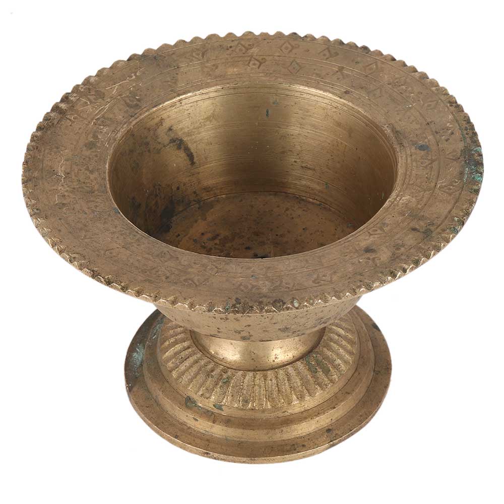 This classic antique brass flower bowl, or container with a pedestal and tarnished finish is ideal for creating stunning flower arrangement centerpieces for weddings, receptions, and other special occasions, house decoration It is composed of high-quality brass and features a historical design. It has a vintage appeal but may be used in contemporary settings.