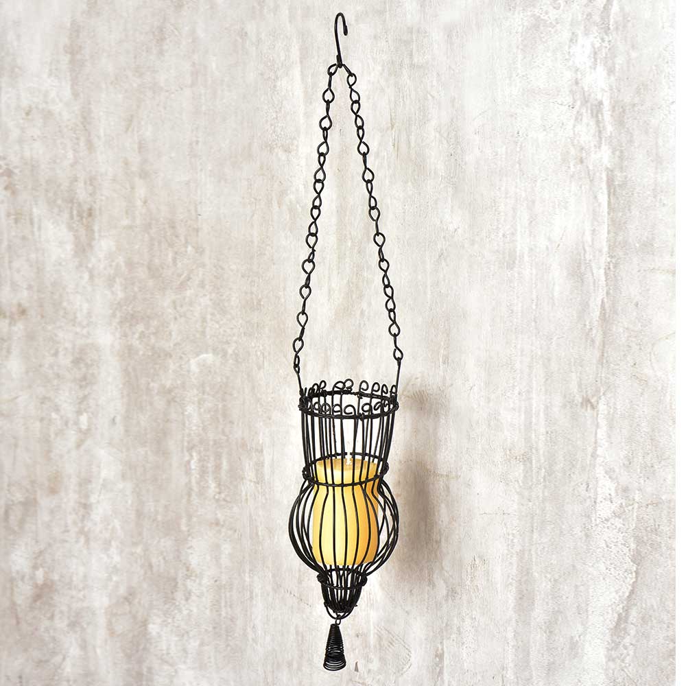 Traditional design features heavy Wrought iron , hand-welded and coated in black color. Extra deep for long candles with sturdy black chain to hang on the ceiling or hang it to wall mount bracket for a decorative look . The wall mounted candle holder does not include the things used for display during photoshoot.