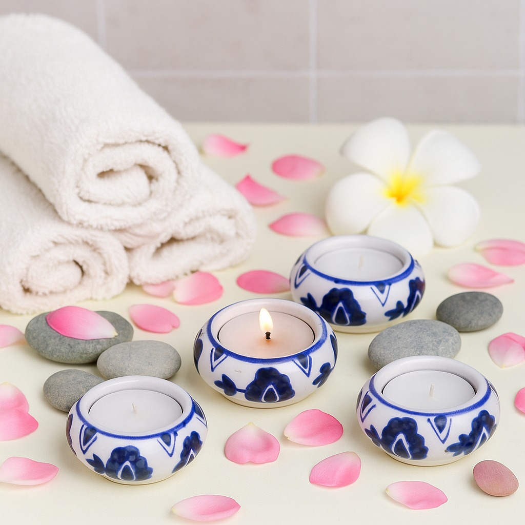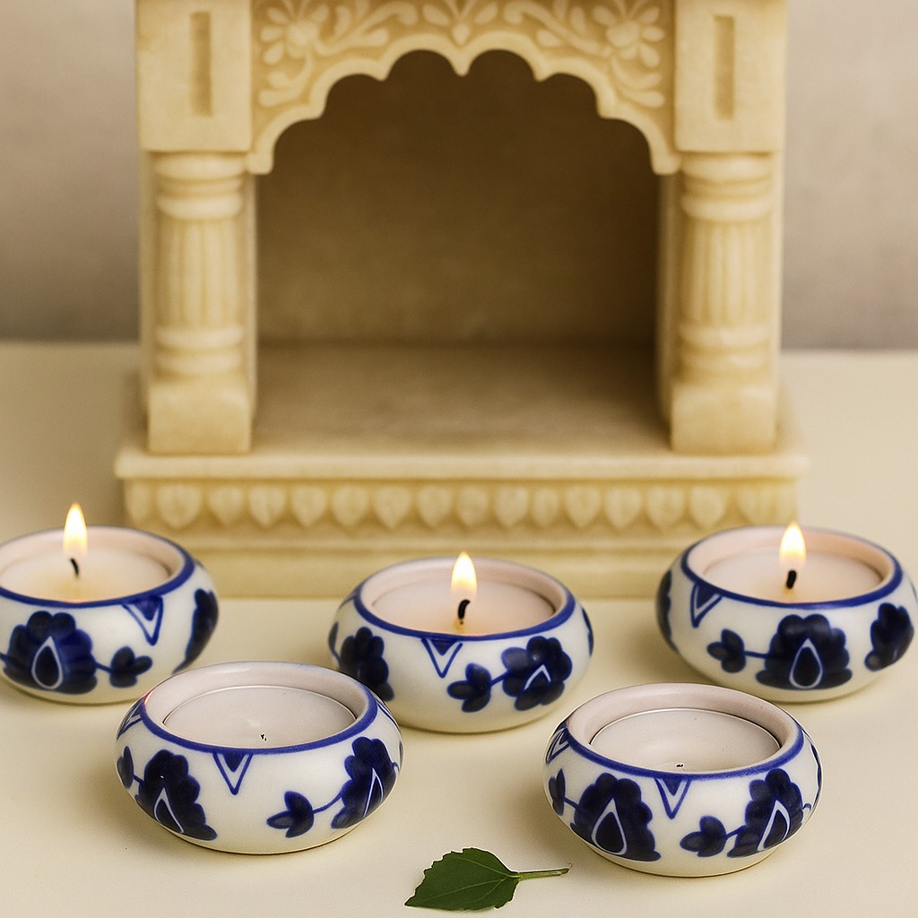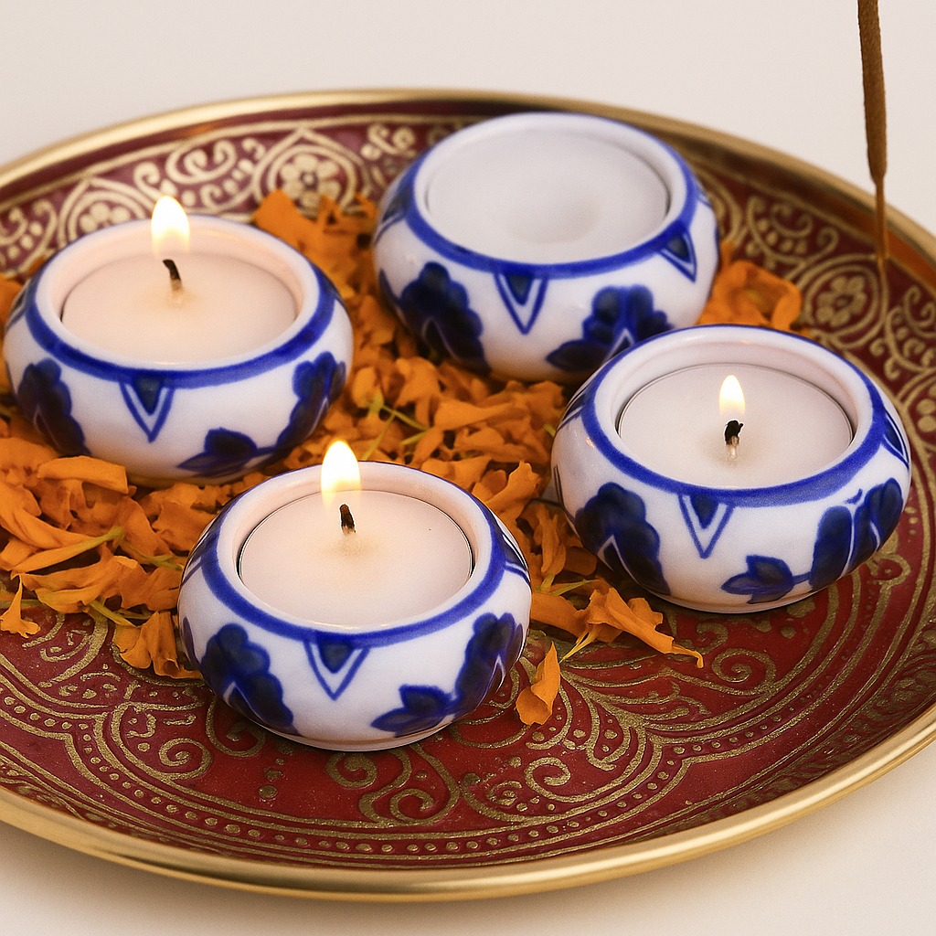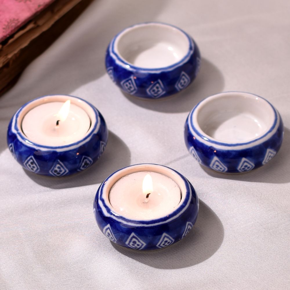 Buy a Ceramic Tea Light Holder online that is a true testament to the mastery of Indian artisans. Handcrafted with precision and love, this high-quality ceramic holder boasts a captivating blend of serene white and calming blue hues, adorned with an intricate diamond pattern. Each piece encapsulates the dedication and artistry of skilled craftsmen, making it a unique and timeless decor item. Tea light holders have long been cherished for their ability to infuse spaces with a warm and gentle glow. Whether gracing your home, restaurant, cafe, shop, or hotel, this holder promises to elevate any setting. Imagine the ethereal radiance emanating from the delicate flames, setting the perfect backdrop for cherished moments shared with your family, friends or relatives. Embrace its charm during special occasions, creating an enchanting atmosphere that lingers in hearts. The Ceramic Tea Light Holder makes for an ideal gift, adding an extra touch of elegance to special, festive, or auspicious celebrations. Let the dance of light kindle bonds and create memories, as this holder illuminates not just spaces, but also the joyous connections that define our lives.
