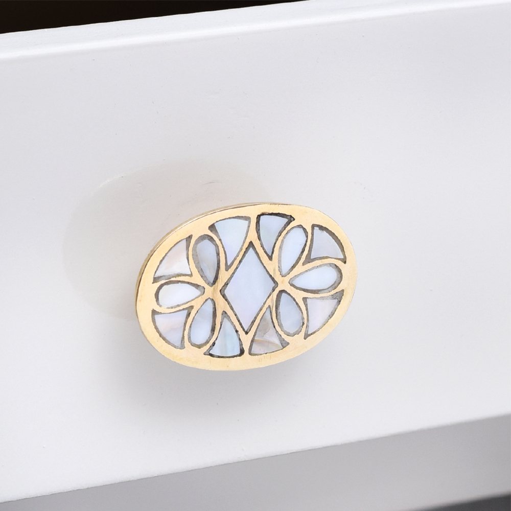 The delicate balance between the soft, glowing white mother of pearl and the warm golden finish makes this knob a sophisticated choice for those who value attention to detail and quality. It’s more than just a functional piece; it’s an accent that will enhance the beauty of your furniture.