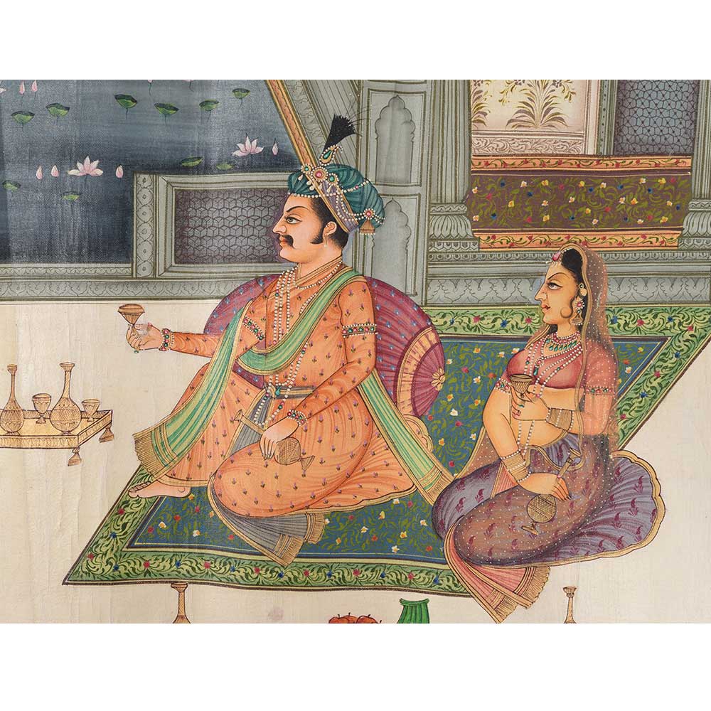 • Mughal Canvas Painting Of Emperor Shahjahan And Mumtaz Mahal Drinking Wine