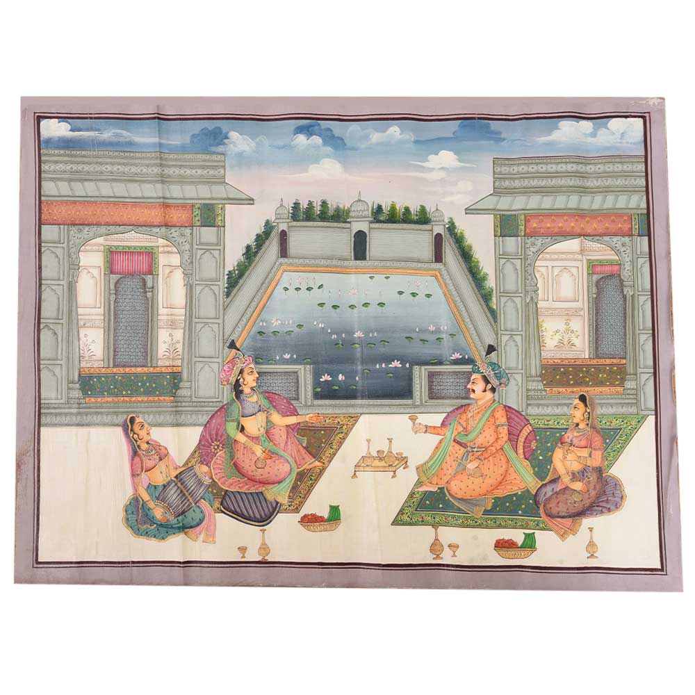 Mughal Canvas Painting Of Emperor Shahjahan And Mumtaz Mahal Drinking Wine