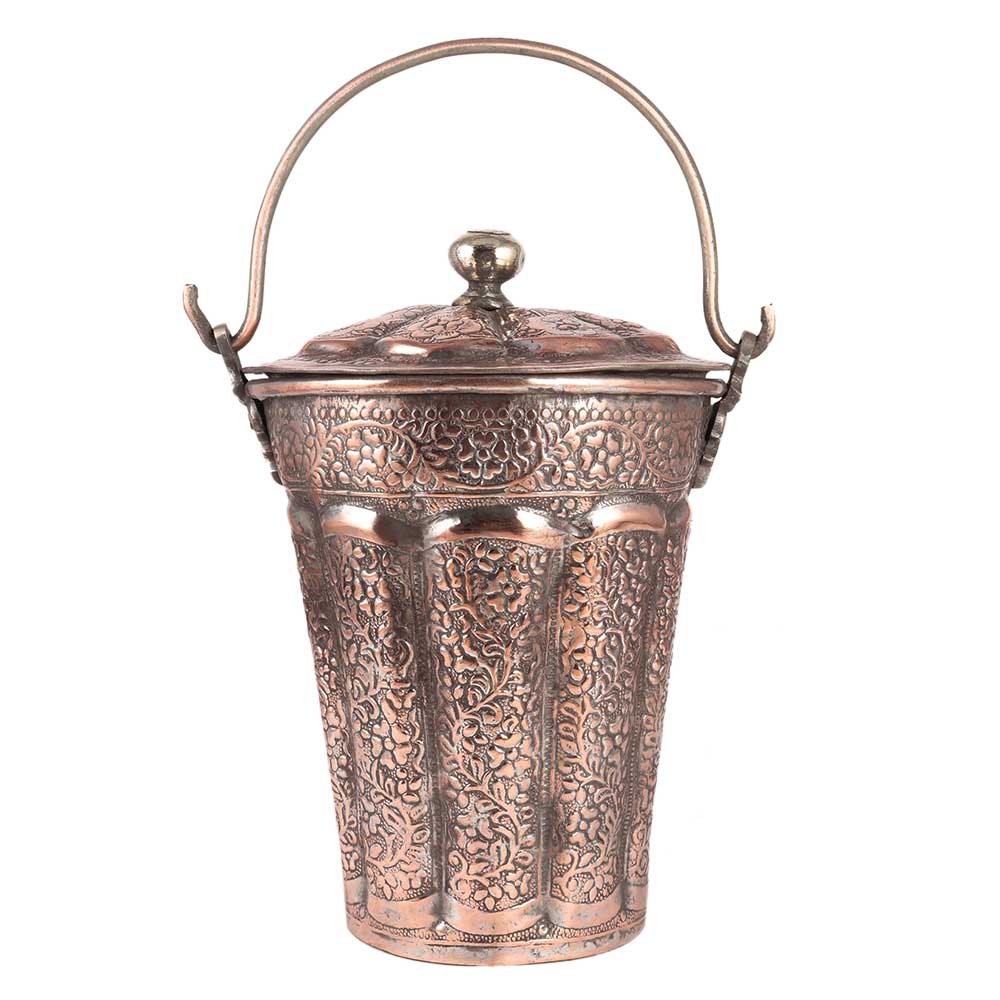 Made by hand Brown Copper Flowers Design Engraved Bucket is a memorable gift for Deepavali, Dhanteras, engagement rings, house warming party, and baby shower.