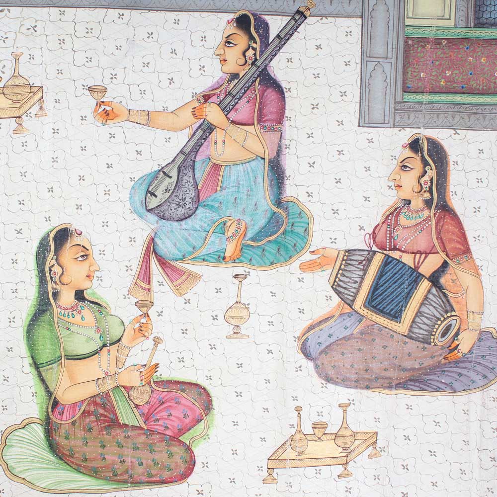 The Mughal monarch is depicted in this miniature painting relaxing with his lover and five attendants. This painting's exquisite brush work reveals its sophisticated nature, painted on old manuscript paper by an artist.