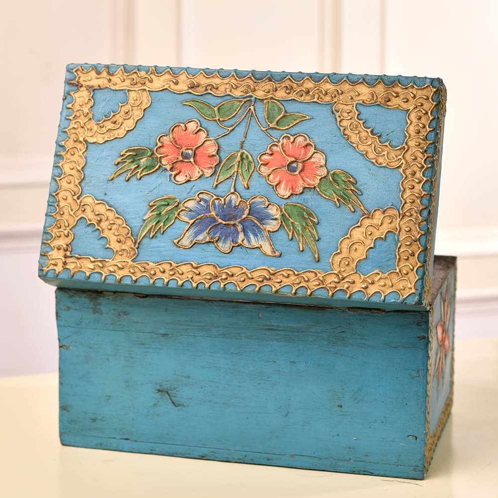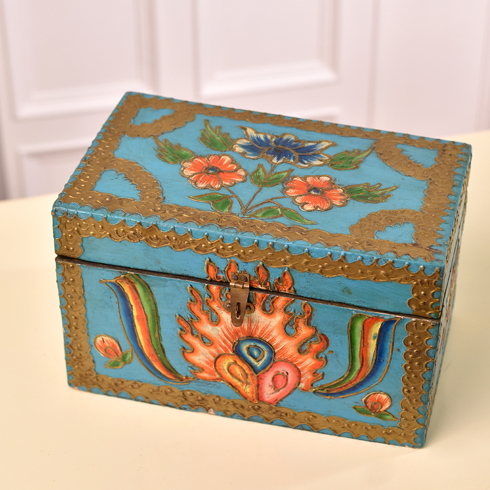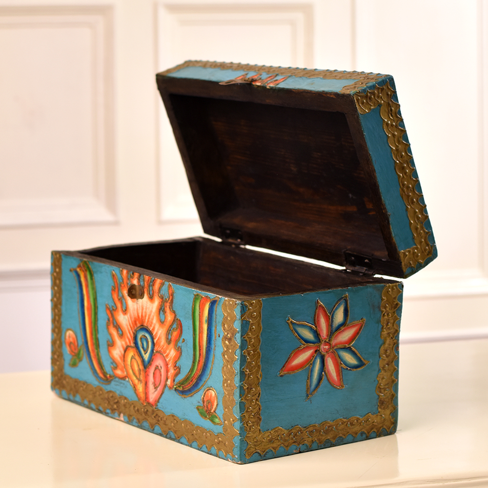 A rectangular wooden box which is a true masterpiece crafted by professional Indian craftsmen with unwavering dedication to their craft. This enchanting box is a work of art, designed to captivate your senses with its stunning beauty and meticulous attention to detail. Handmade from high-quality wood, this box boasts a rich and natural texture that exudes elegance and sophistication. The box's multi-colour finish, achieved through careful hand-painting, adds a delightful vibrancy, making it an eye-catching addition to any room. Its intricate engravings tell a story of tradition and culture, showcasing the artisan's mastery of their craft. Practicality meets aesthetics with a secure latch, ensuring your precious jewelry or small trinkets remain safely stored. Versatile in its functionality, it is not only a jewelry box but also an ideal storage solution for various small items. Its undeniable charm makes it an excellent choice for exhibitions or a remarkable gift to celebrate special or festive occasions. Embrace the artistry of India with this magnificent wooden box, where craftsmanship and beauty merge harmoniously.