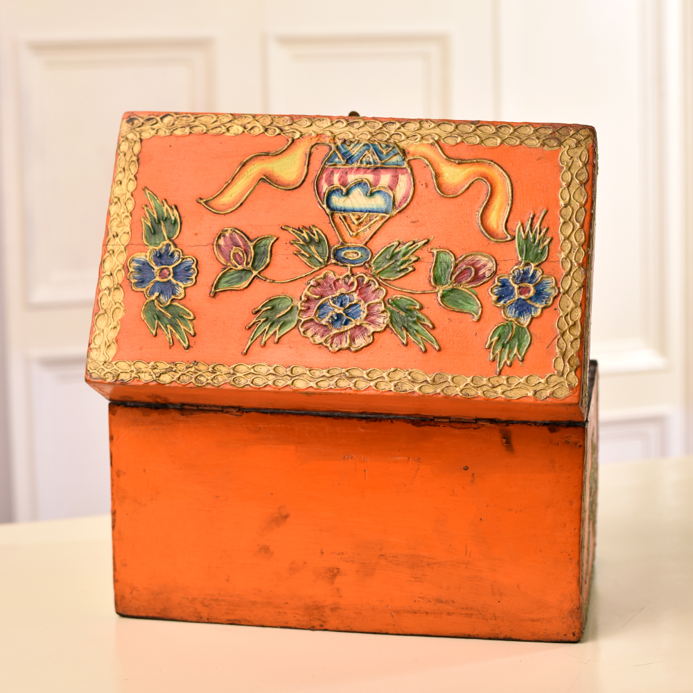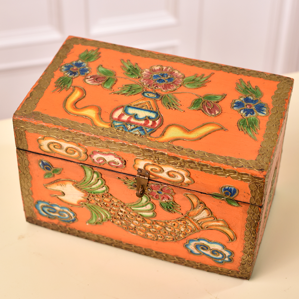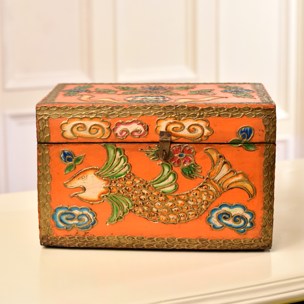 Unveil the mystique of our crafted wooden box adorned with captivating fish and floral engravings. Handmade by highly skilled Indian artisans, this masterpiece is a testament to their expertise and dedication. Fashioned from high-quality wood, the box is a canvas of vibrant hues, a celebration of traditional artistry. Equipped with a secure latch, this multifunctional box is perfect for safeguarding your precious jewelry or cherished small items. Its versatility extends beyond utility - it's a piece of art that begs to be displayed. Imagine it gracing the center stage at an exhibition, commanding attention with its intricate designs and rich colours. Beyond personal use, this box makes for an enchanting gift, a token of love on special or festive occasions. Each stroke, each colour, and every curve tell a story of culture, skill, and the timeless beauty of handmade craftsmanship. Elevate your surroundings with this wooden marvel, where tradition meets contemporary elegance.