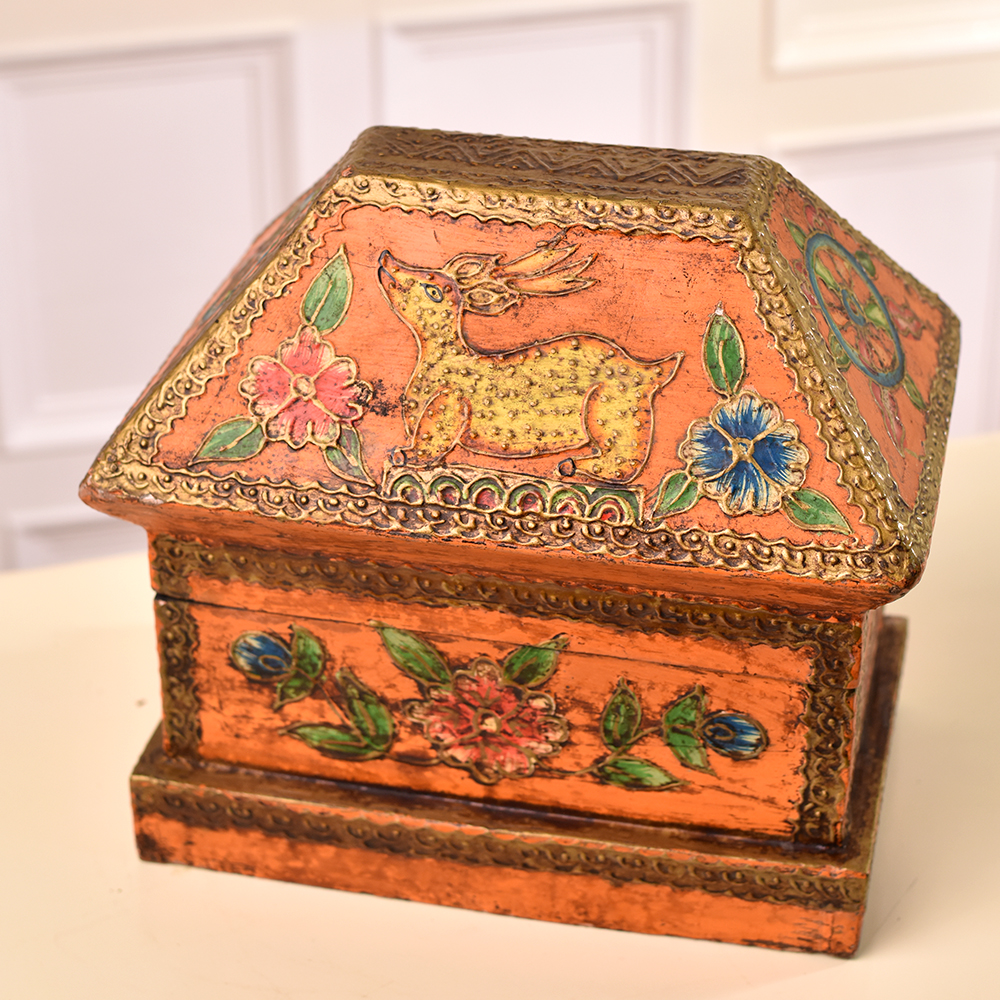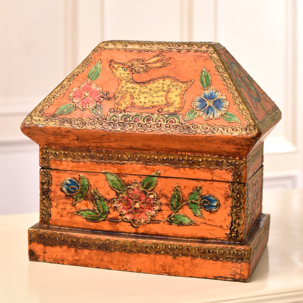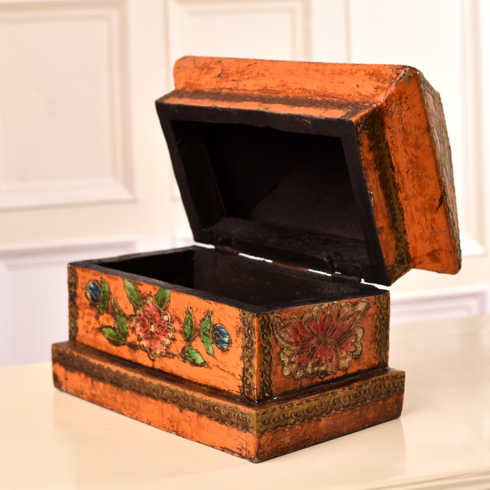 Discover the epitome of craftsmanship with our exquisite wooden box that is a testament to the skill of Indian artisans. Handmade with precision and passion, this multi-coloured marvel features intricate engravings of animals and florals that tell a story of nature's beauty. Crafted from high-quality wood, each box is a unique masterpiece, showcasing the artistry passed down through generations. Equipped with a secure latch, it doubles as a jewelry box, keeping your precious treasures safe. Beyond its practicality, this box is a work of art fit for display at exhibitions, a conversation starter that captivates with its vibrant hues and detailed carvings. What better way to celebrate special occasions than by gifting your family, friends or relatives this symbol of tradition and artistry? Whether it's a birthday, anniversary, or festive celebration, this wooden box is a timeless token of affection that transcends mere utility. Embrace the beauty of handmade craftsmanship and the spirit of India with this enchanting creation.