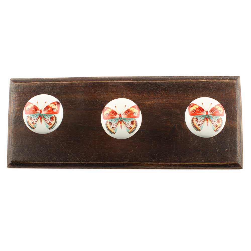 Multicolor Butterfly Ceramic Wooden Hook. A Perfect Complement to the Soft Tone of the Wood are these White Traditional Hat and Coat Hook Made of Genuine Porcelain and Brass. It can be used to Hang Jewelry, Leashes, Towels, Scarves, Light Weight Sweaters, Caps etc.