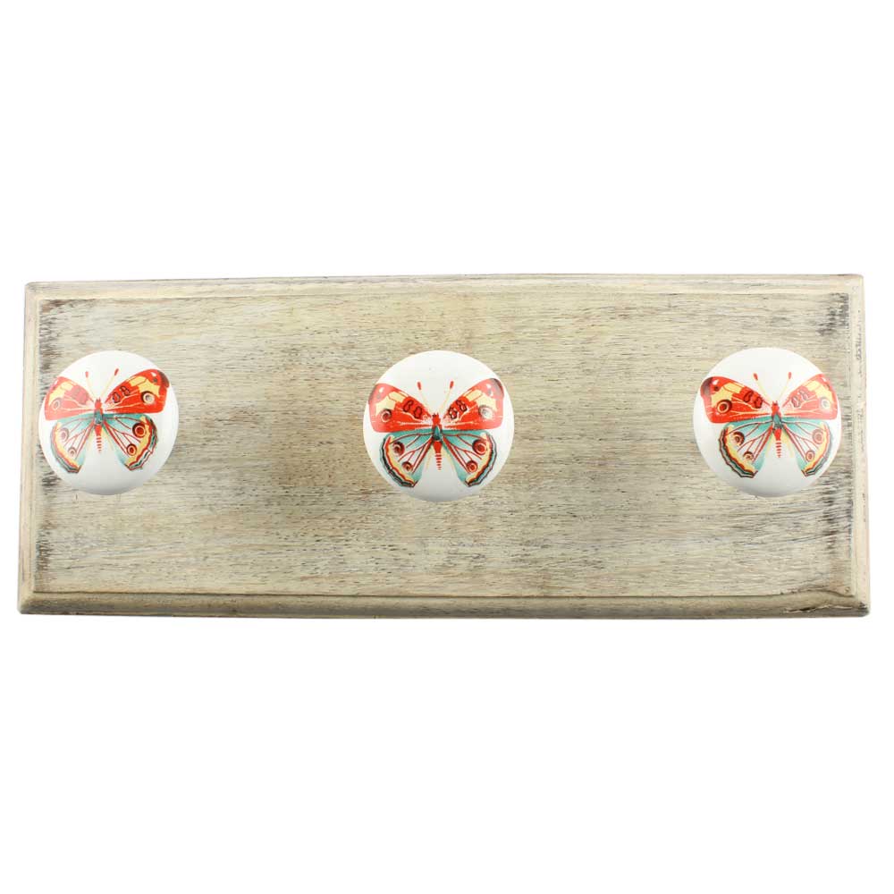 Multicolor Butterfly Ceramic Wooden Hook. A Perfect Complement to the Soft Tone of the Wood are these White Traditional Hat and Coat Hook Made of Genuine Porcelain and Brass. It can be used to Hang Jewelry, Leashes, Towels, Scarves, Light Weight Sweaters, Caps etc.