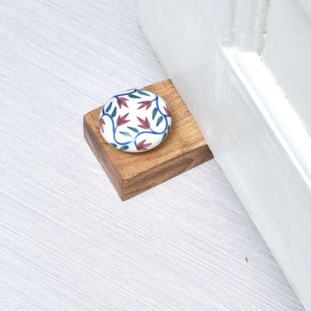 Crafted with care, this door stopper not only keeps your doors in place but also serves as a beautiful decorative element. The ceramic top is hand-painted with intricate, colorful designs, making each piece unique. The wooden base provides stability and durability, ensuring that this door stopper will protect your walls and doors for years to come.