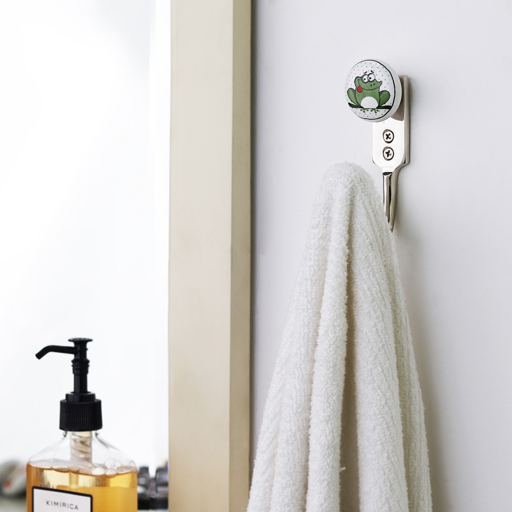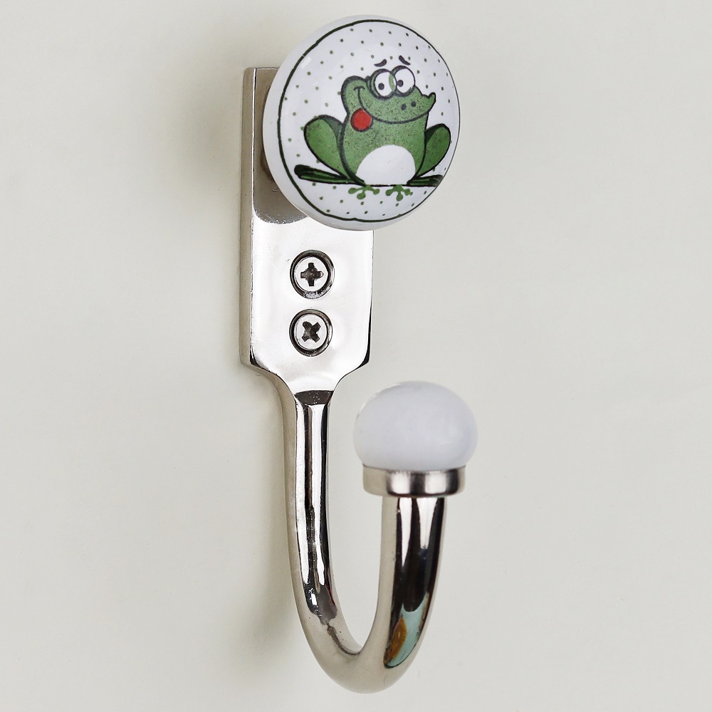 Material: Hand-painted ceramic frog head with zinc alloy hook Finish: Glossy multicolor ceramic, matte-finish zinc base Installation: Single-screw mount; hardware included