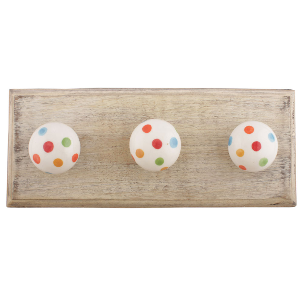 Multicolor Polka Dotted Ceramic Wooden Hooks. A Perfect Complement to the Soft Tone of the Wood are these White Traditional Hat and Coat Hook Made of Genuine Porcelain and Brass. It can be used to Hang Jewelry, Leashes, Towels, Scarves, Light Weight Sweaters, Caps etc.