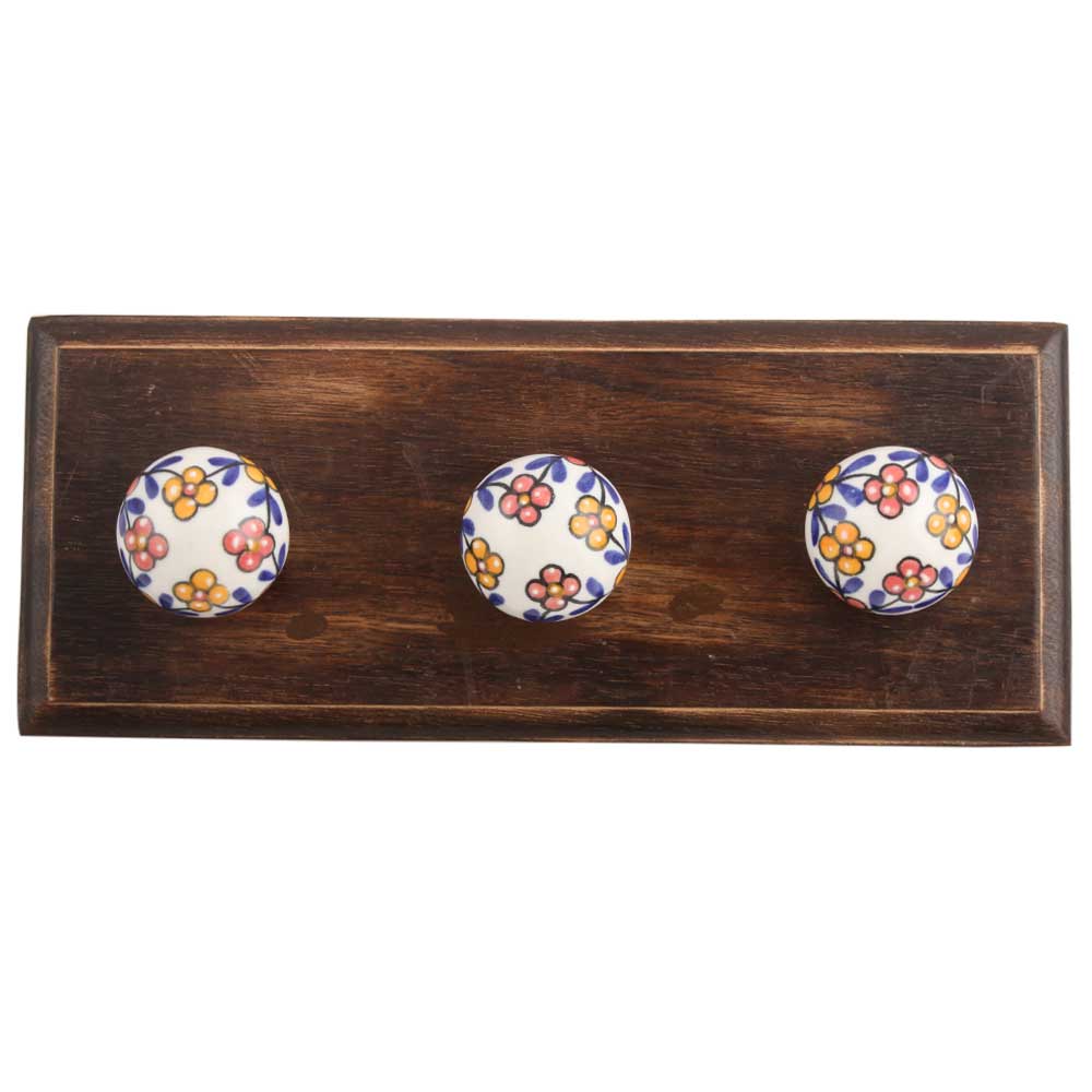Mustard And Red Tiny Flower Ceramic Wooden Hook. A Perfect Complement to the Soft Tone of the Wood are these White Traditional Hat and Coat Hook Made of Genuine Porcelain and Brass. It can be used to Hang Jewelry, Leashes, Towels, Scarves, Light Weight Sweaters, Caps etc.