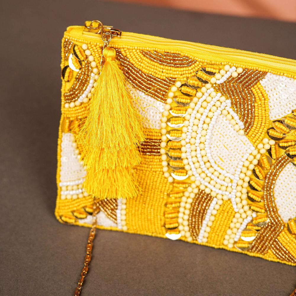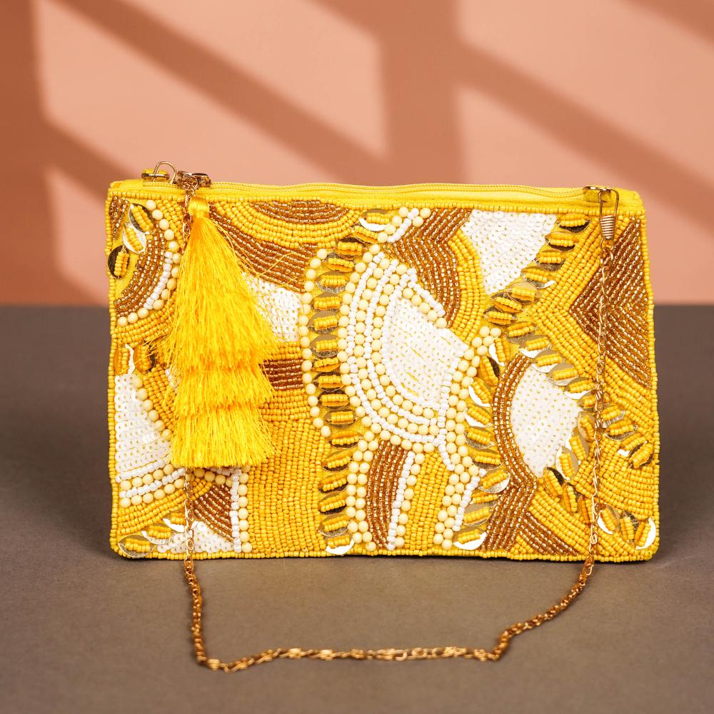 Capture boho glamour with this glowing Mustard cotton and beads handbag, designed for the free spirit who embraces color and craftsmanship. Featuring curved and geometric beadwork in warm metallic shades, this bag reflects artistic expression and effortless style. The golden tassel swings with every step, while the shoulder-length chain offers versatile wear. Pair it with whites, earth tones, or bold prints to amplify your bohemian vibe.