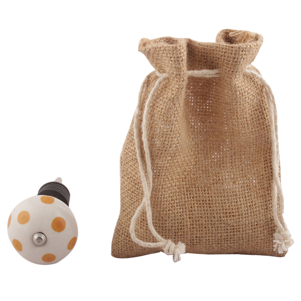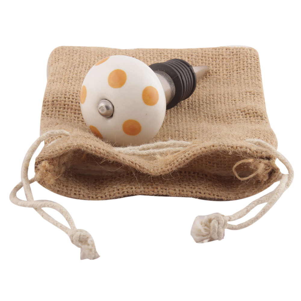 Mustard Polka Dotted Ceramic Floral Wine Stopper. Zinc Alloy Wine Bottle Stopper with Attractive Jute Bag Packaging.