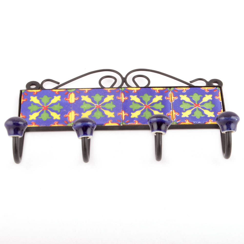 Navy Blue And Green Floral Ceramic Tiles Hooks. When Put on Wall or Cabinet it is an Art in itself. The Metal Part of this Hook is Black Powder Coated.