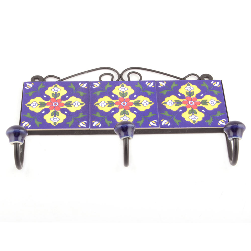 Navy Blue And Red Flower Tiles Hooks. When Put on Wall or Cabinet it is an Art in itself. The Metal Part of this Hook is Black Powder Coated.