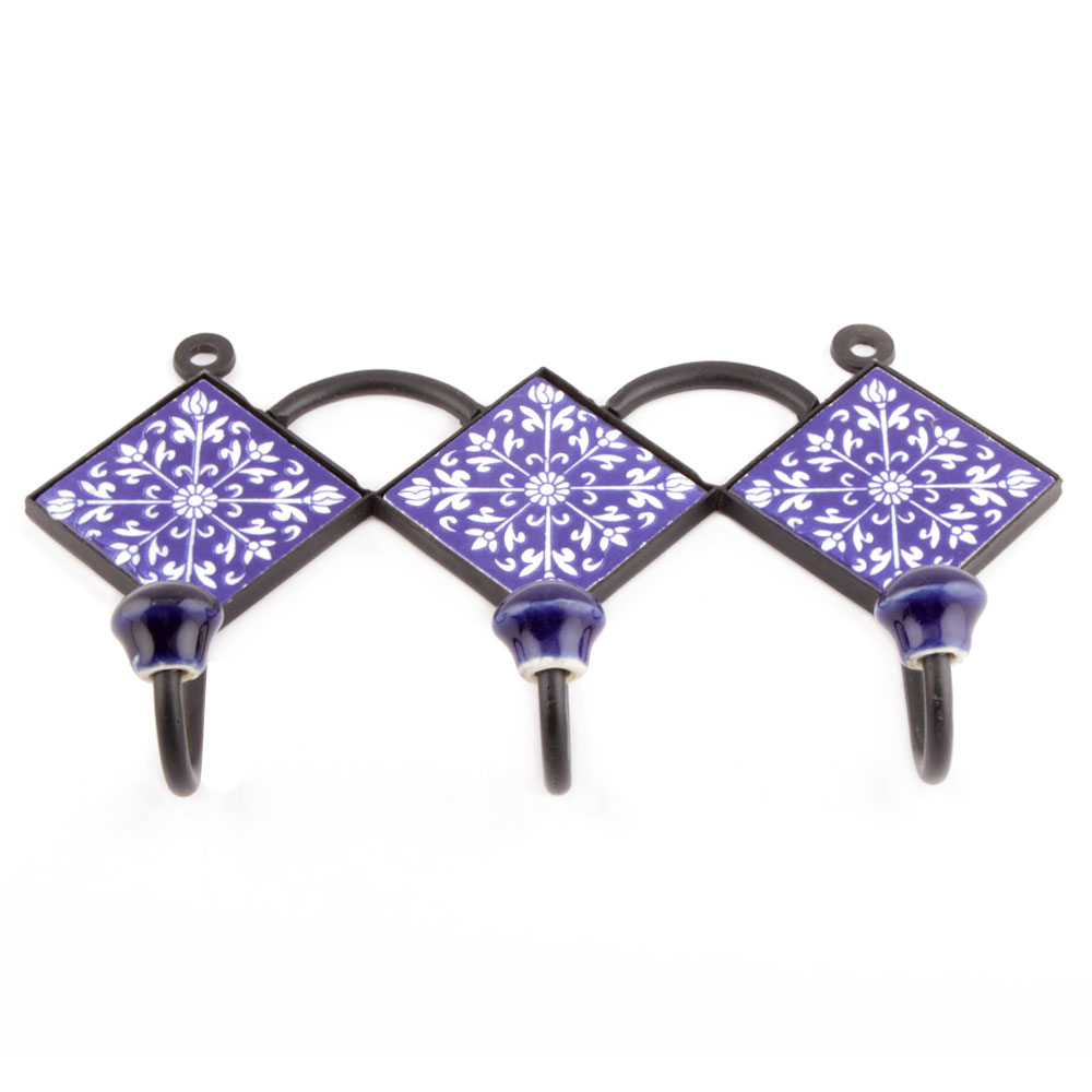 Yellow Navy Blue Floral Tiles Hooks. When Put on Wall or Cabinet it is an Art in itself. The Metal Part of this Hook is Black Powder Coated.