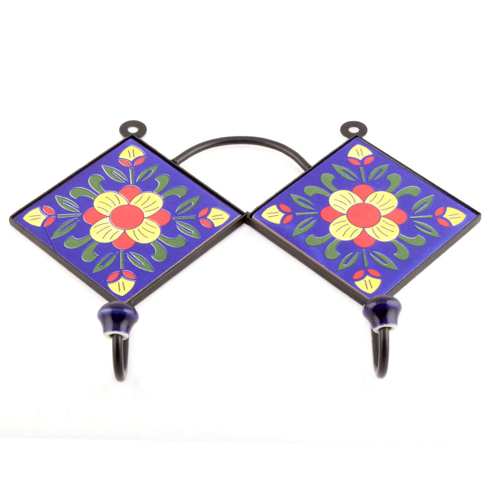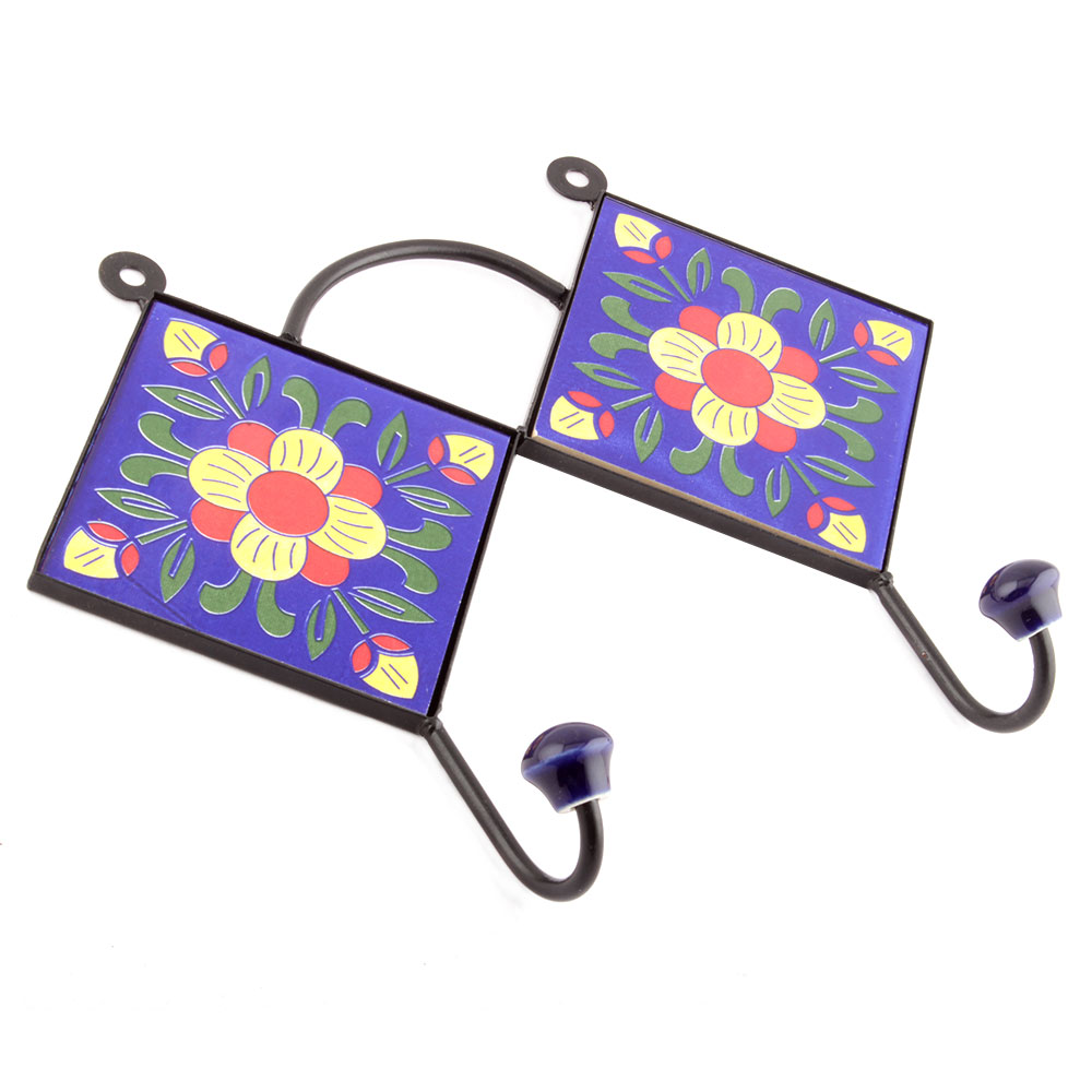 Navy Blue And Yellow Ceramic Floral Tiles Hooks. When Put on Wall or Cabinet it is an Art in itself. The Metal Part of this Hook is Black Powder Coated.