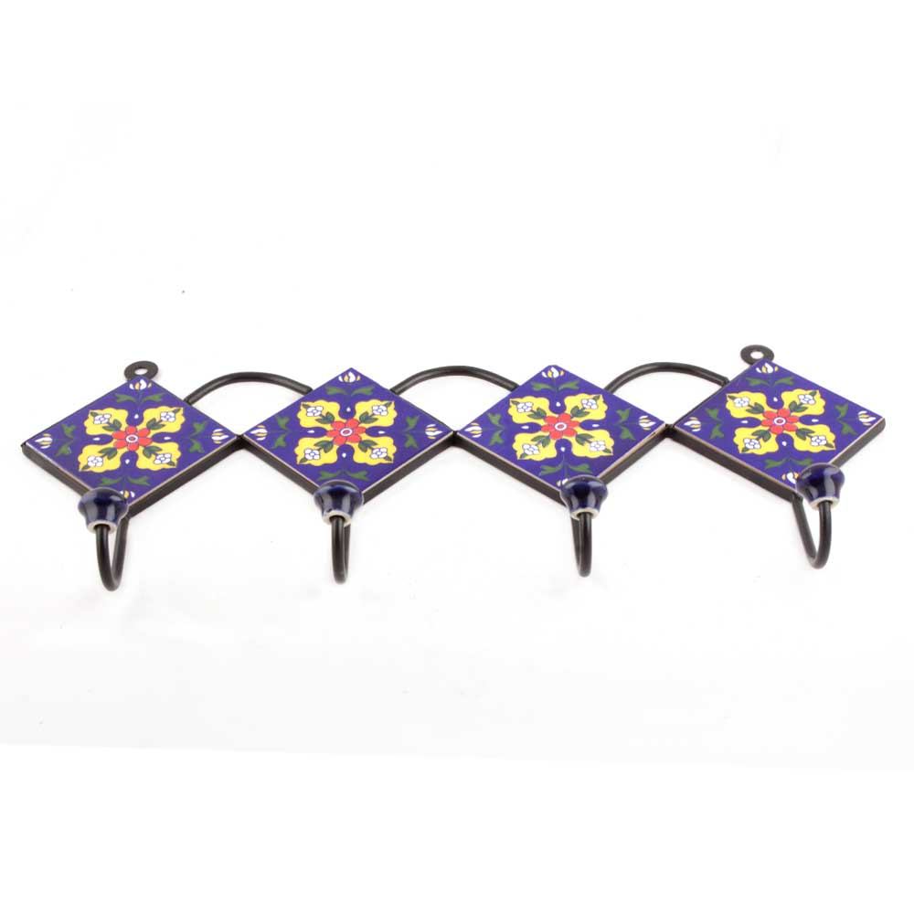 Navy Blue And Yellow Ceramic Flower Tiles Hooks. When Put on Wall or Cabinet It is An Art in Itself. The Metal Part of this Hook is Black Powder Coated.