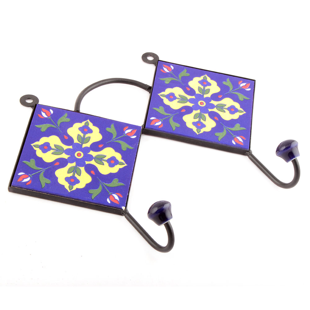 Navy Blue And Yellow Leaf Ceramic Floral Tiles Hooks. When Put on Wall or Cabinet it is an Art in itself. The Metal Part of this Hook is Black Powder Coated.