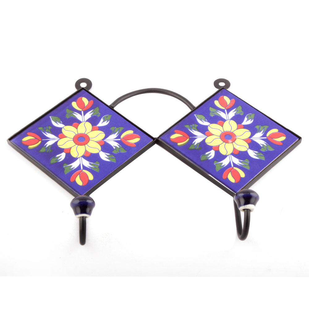 Navy Blue And Yellow Sun Flower Ceramic Tiles Hooks. When Put on Wall or Cabinet it is an Art in itself. The Metal Part of this Hook is Black Powder Coated.