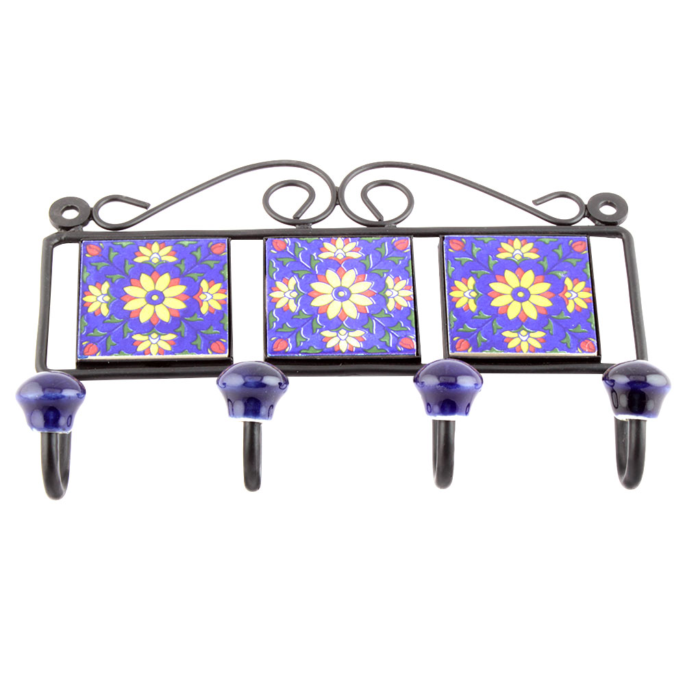 Navy Blue And Yellow Sun Flower Tiles Hooks. When Put on Wall or Cabinet it is an Art in itself. The Metal Part of this Hook is Black Powder Coated.