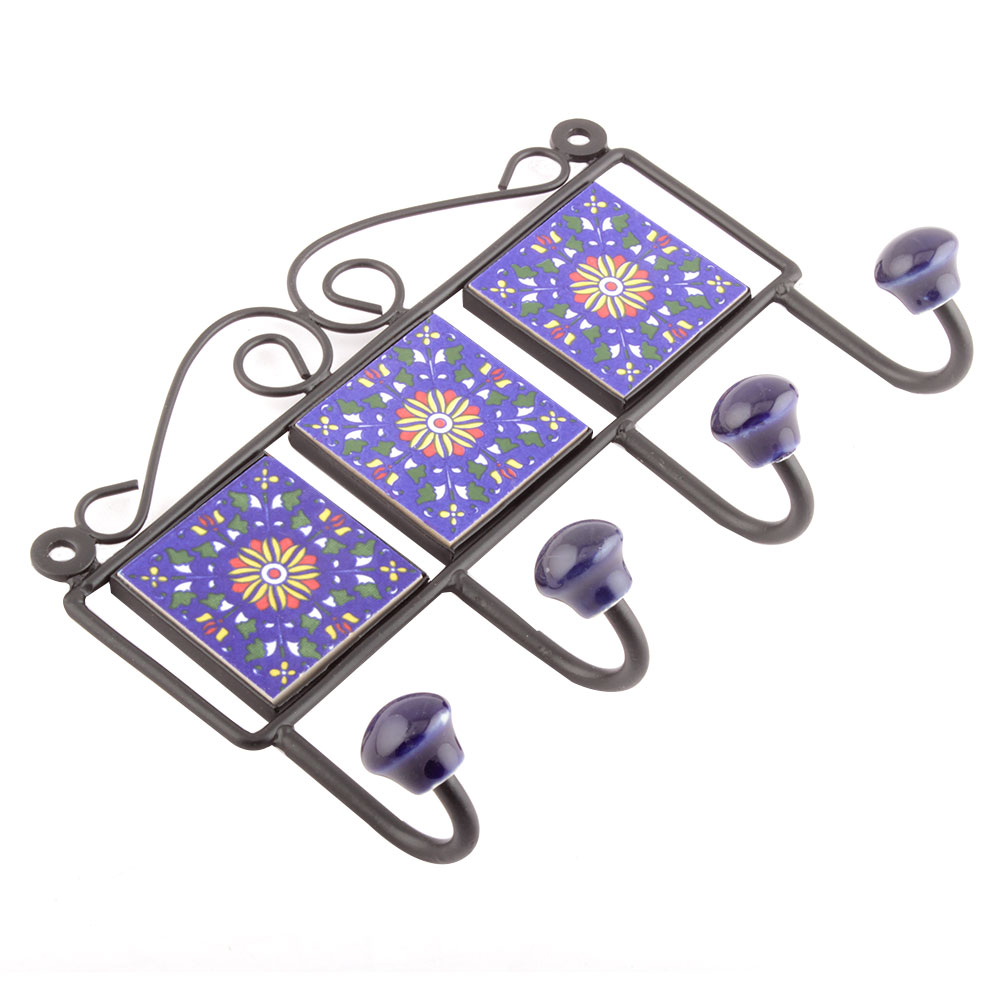 Navy Blue And Yellow Sun Flower Tiles Hooks. When Put on Wall or Cabinet it is an Art in itself. The Metal Part of this Hook is Black Powder Coated.