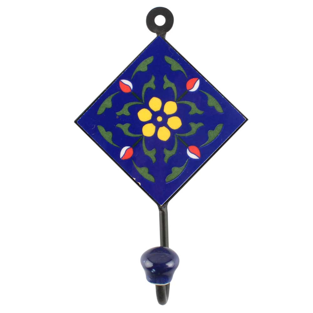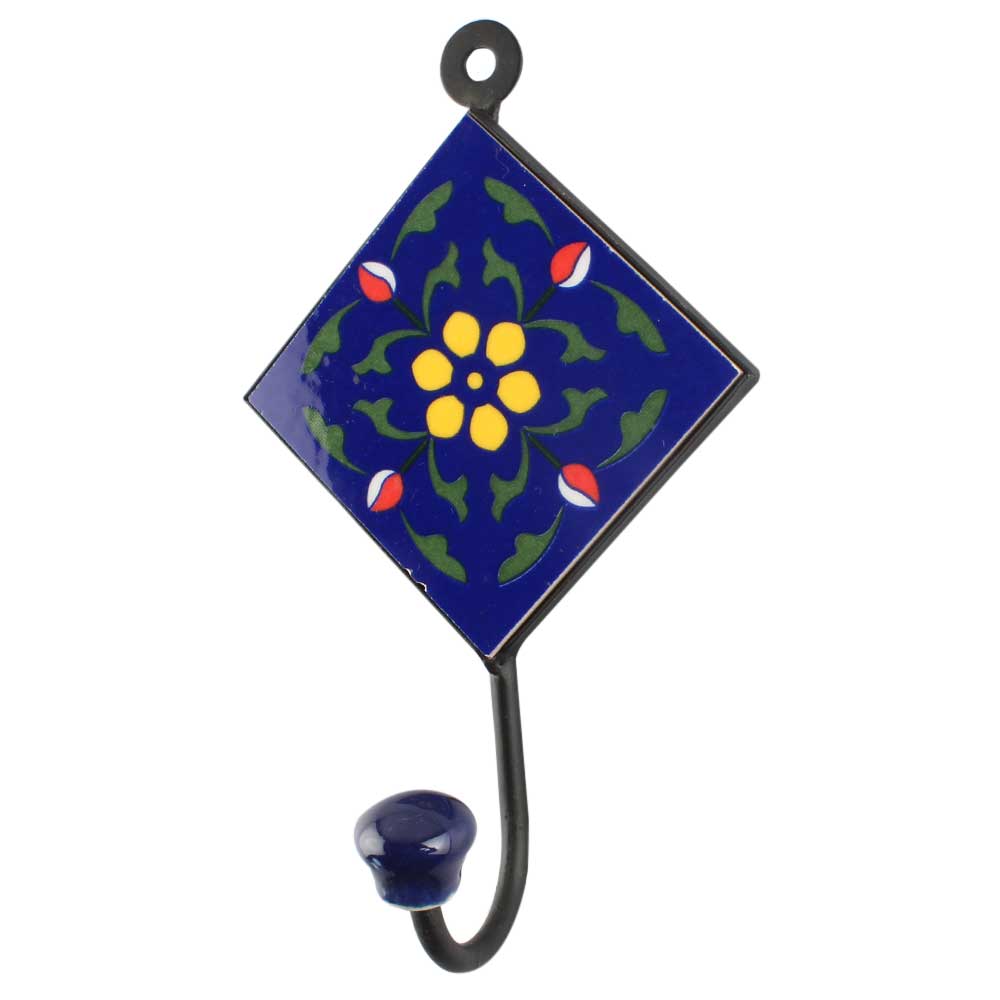 Navy Blue Ceramic Floral Tile Hook. When Put on Wall or Cabinet It is An Art in Itself. The Metal Part of this Hook is Black Powder Coated.