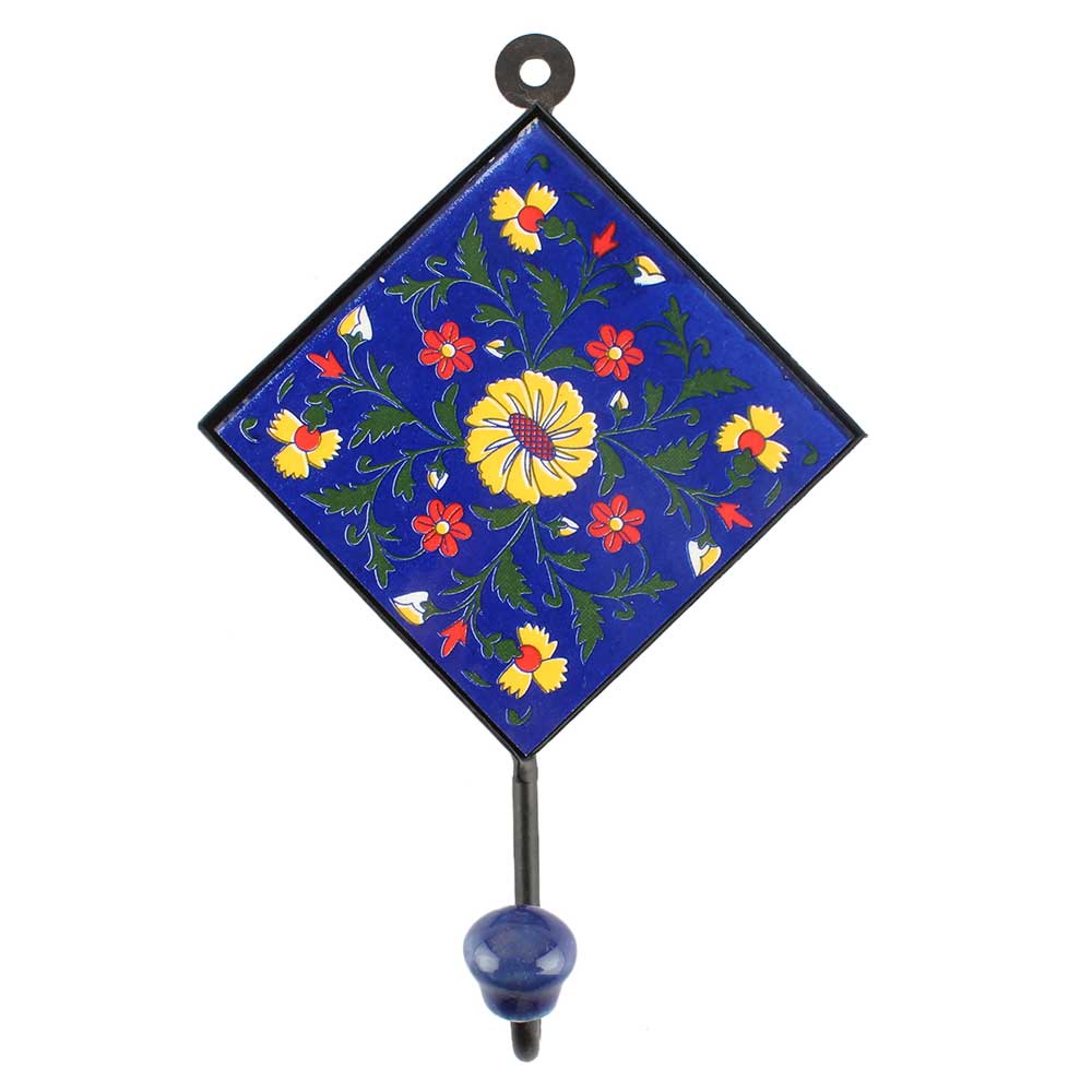 Navy Blue Ceramic Floral Tile Hook. When Put on Wall or Cabinet It is An Art in Itself. The Metal Part of this Hook is Black Powder Coated.