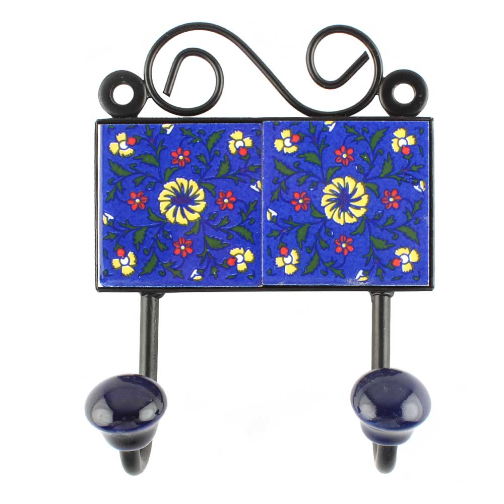 Navy Blue Ceramic Floral Tiles Hook. When Put on Wall or Cabinet It is An Art in Itself. The Metal Part of this Hook is Black Powder Coated.