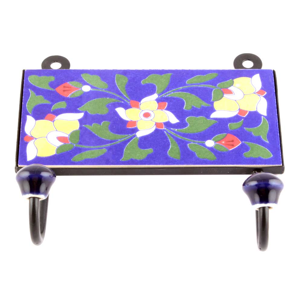 Navy Blue Ceramic Floral Tiles Hooks. When Put on Wall or Cabinet it is an Art in itself. The Metal Part of this Hook is Black Powder Coated.
