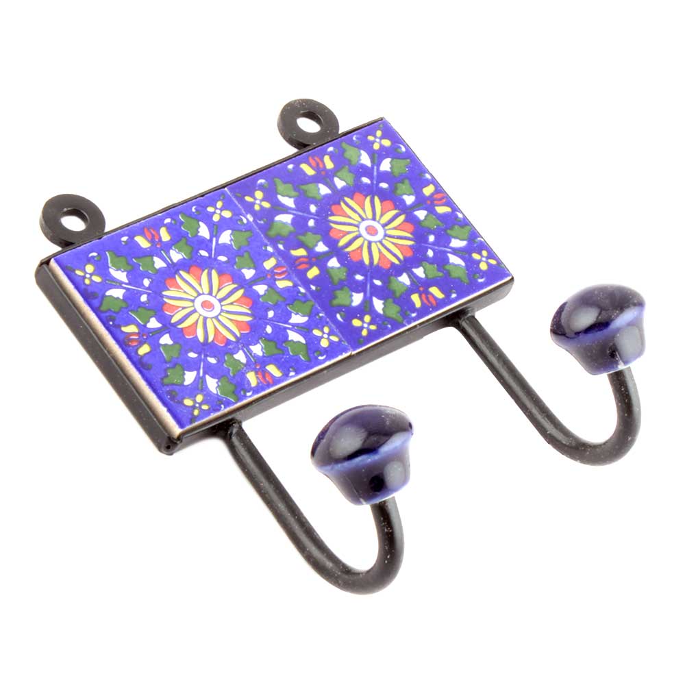 Navy Blue Floral Tiles Hooks. When Put on Wall or Cabinet it is an Art in itself. The Metal Part of this Hook is Black Powder Coated.