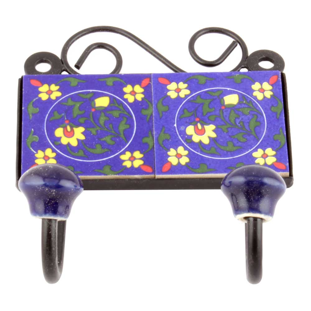 Navy Blue Forest Green Leaf Floral Tiles Hooks. When Put on Wall or Cabinet it is an Art in itself. The Metal Part of this Hook is Black Powder Coated.