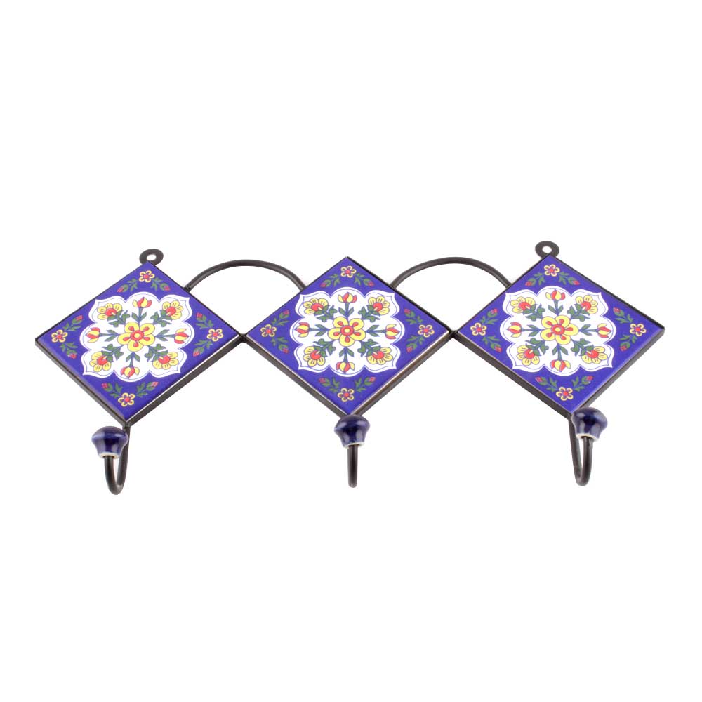 Navy Blue Leaf Floral Ceramic Tiles Hooks. When Put on Wall or Cabinet it is an Art in itself. The Metal Part of this Hook is Black Powder Coated.