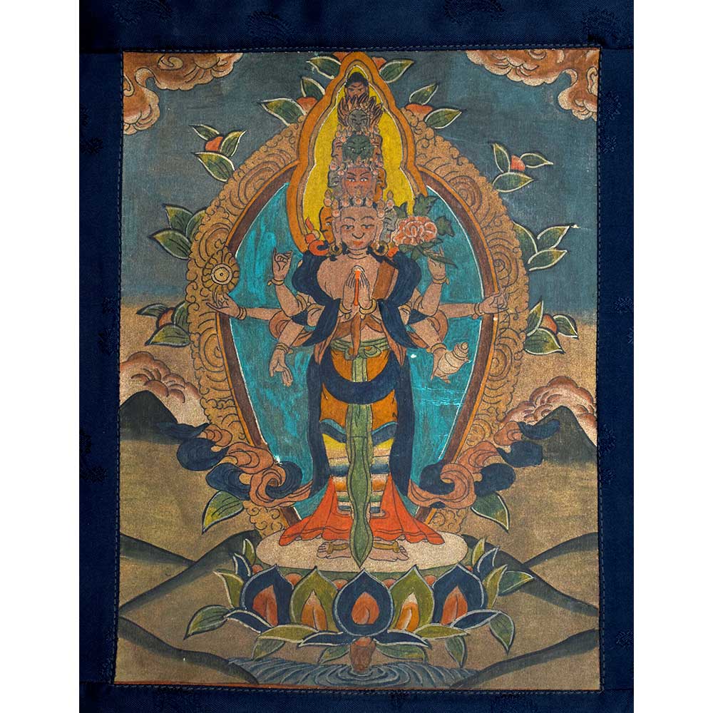 This Thangka painting depicts Lord Avalokiteshvara with six arms the number, forms and colors of his eleven heads are equivalent to the thousand-armed Avalokiteshvara, 10 of whom are benevolent and one rageful. He carries a lotus, a bow, and a vase in his three right arms. He carries a white rosary and ritual jewellery in two of his left arms.
