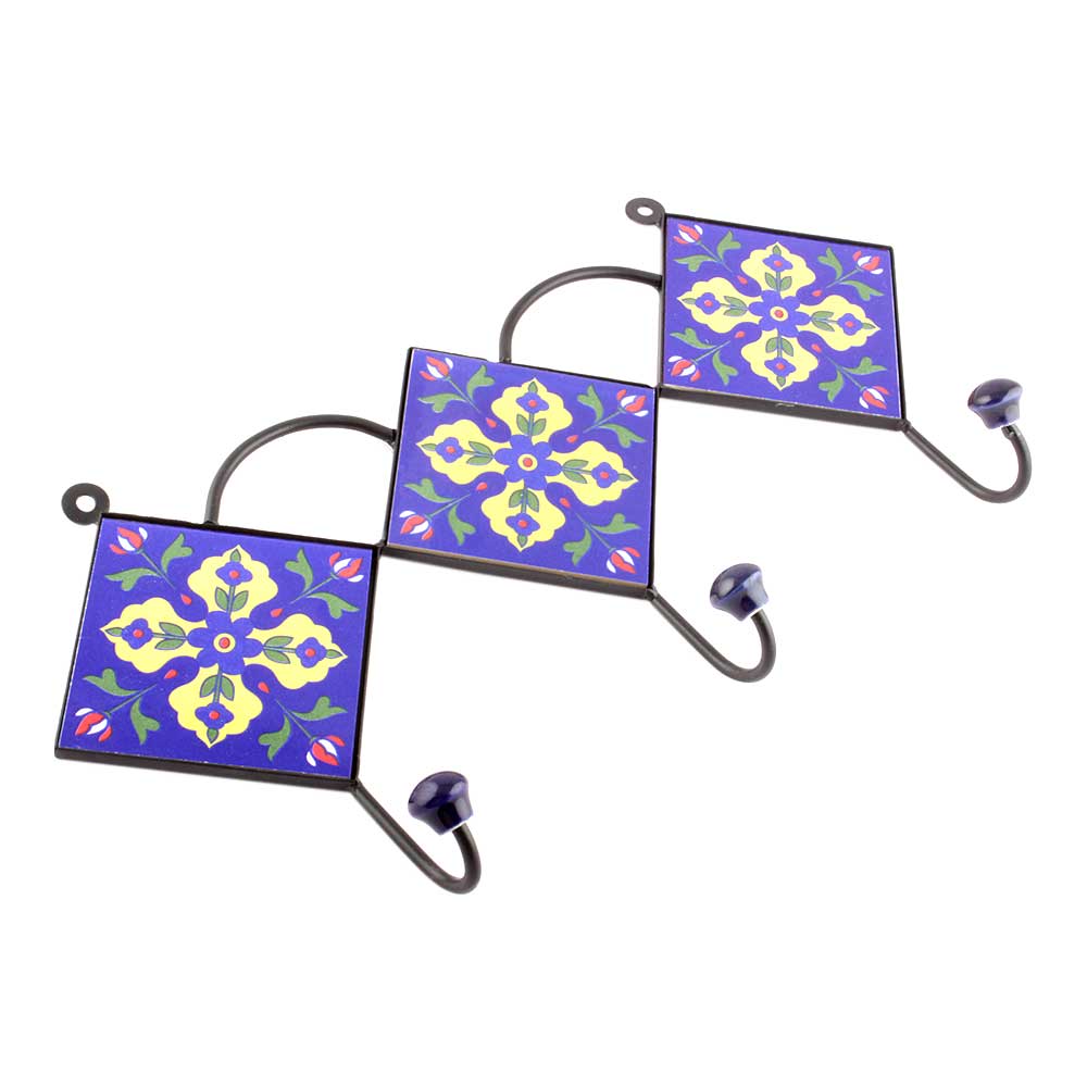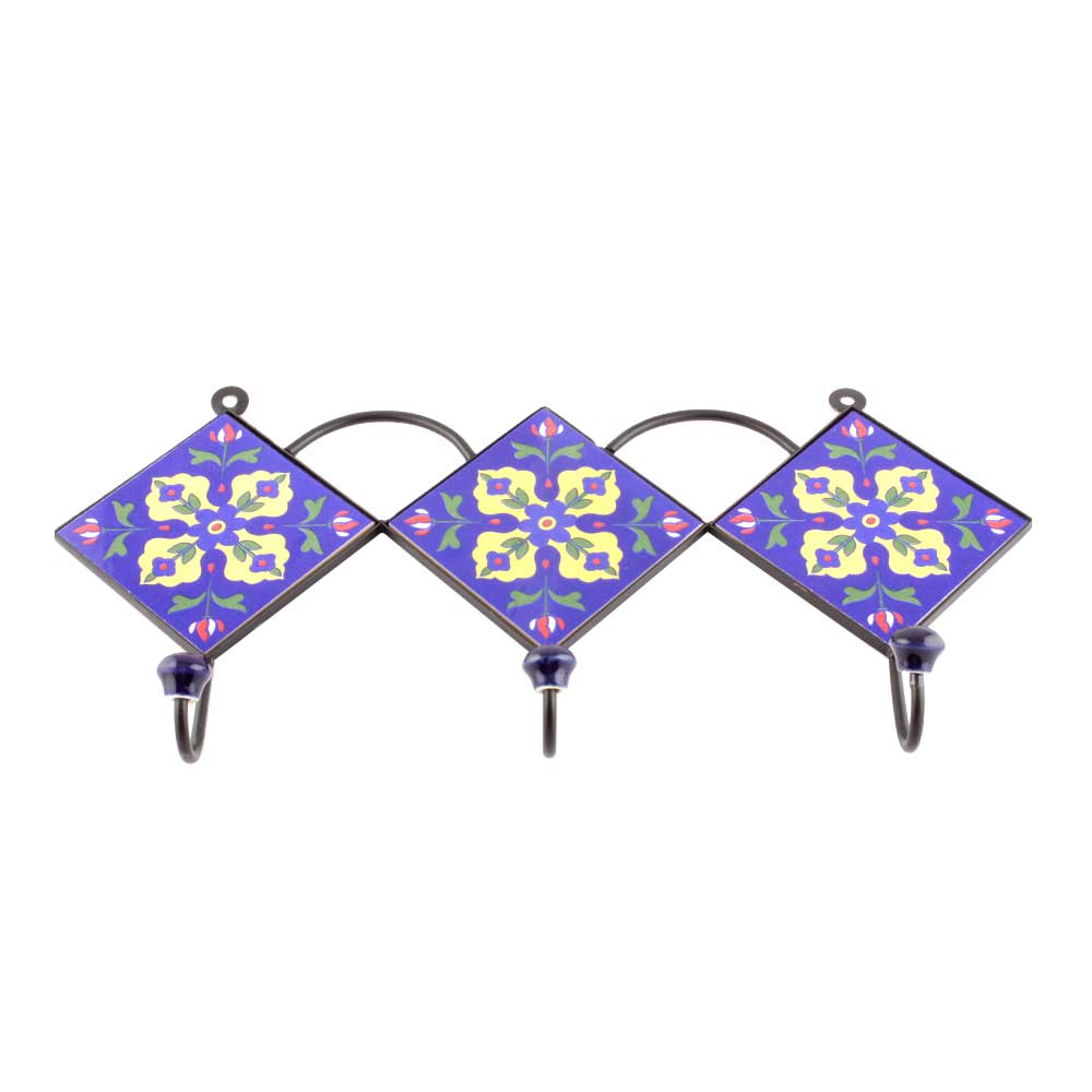 Navy Blue Triangle Ceramic Floral Tiles Hooks. When Put on Wall or Cabinet it is an Art in itself. The Metal Part of this Hook is Black Powder Coated.