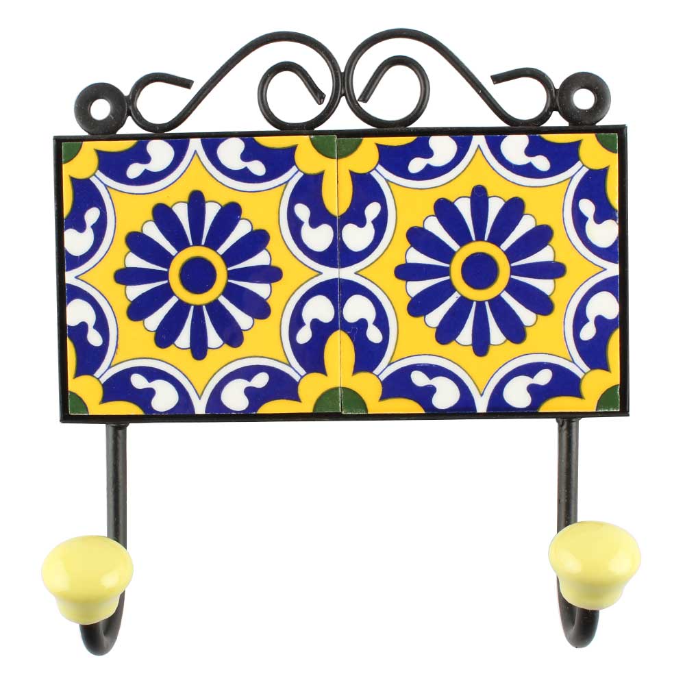 Navy Blue Wheel Flower Ceramic Tiles Hook. When Put on Wall or Cabinet It is An Art in Itself. The Metal Part of this Hook is Black Powder Coated.